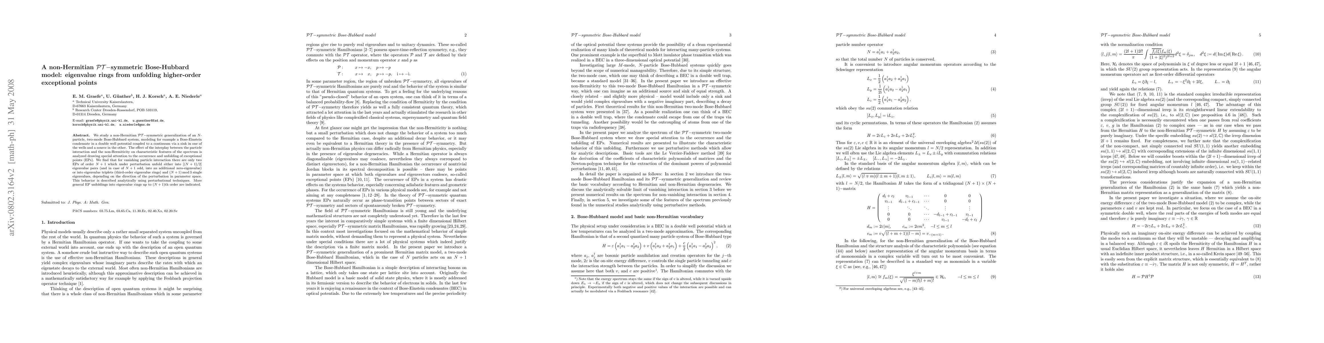 We study a non-Hermitian $PT-$symmetric generalization of an $N$-particle, two-mode Bose-Hubbard system, modeling for example a Bose-Einstein condensate in a double well potential coupled to a continuum via a sink in one of the wells and a source in the other. The effect of the interplay between the particle interaction and the non-Hermiticity on characteristic features of the spectrum is analyzed drawing special attention to the occurrence and unfolding of exceptional points (EPs). We find that for vanishing particle interaction there are only two EPs of order $N+1$ which under perturbation unfold either into $[(N+1)/2]$ eigenvalue pairs (and in case of $N+1$ odd, into an additional zero-eigenvalue) or into eigenvalue triplets (third-order eigenvalue rings) and $(N+1)\mod 3$ single eigenvalues, depending on the direction of the perturbation in parameter space. This behavior is described analytically using perturbational techniques. More general EP unfoldings into eigenvalue rings up to $(N+1)$th order are indicated.