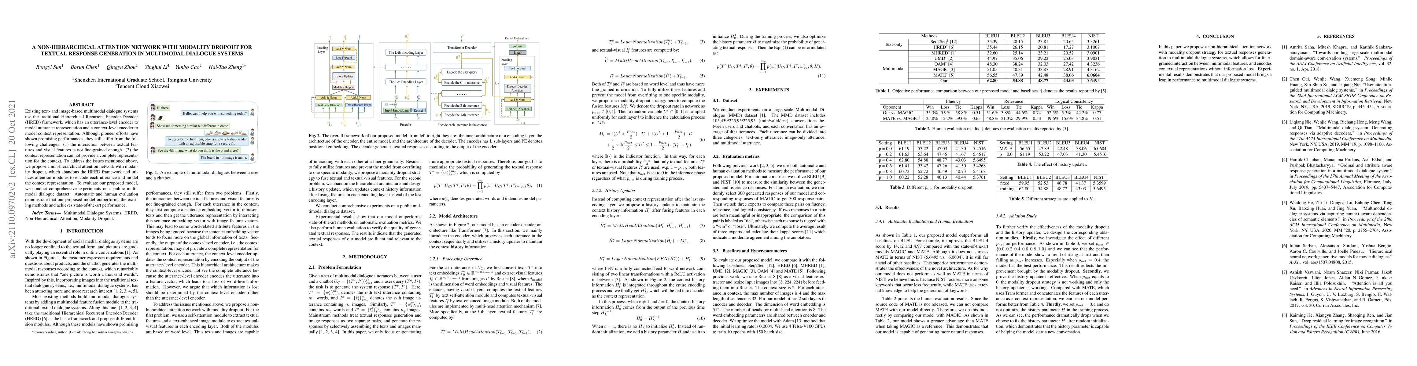 The paper proposes a non-hierarchical attention network with modality dropout for textual response generation in multimodal dialogue systems, abandoning the traditional Hierarchical Recurrent Encoder-Decoder (HRED) framework and utilizing attention modules to encode each utterance and model context representation.
