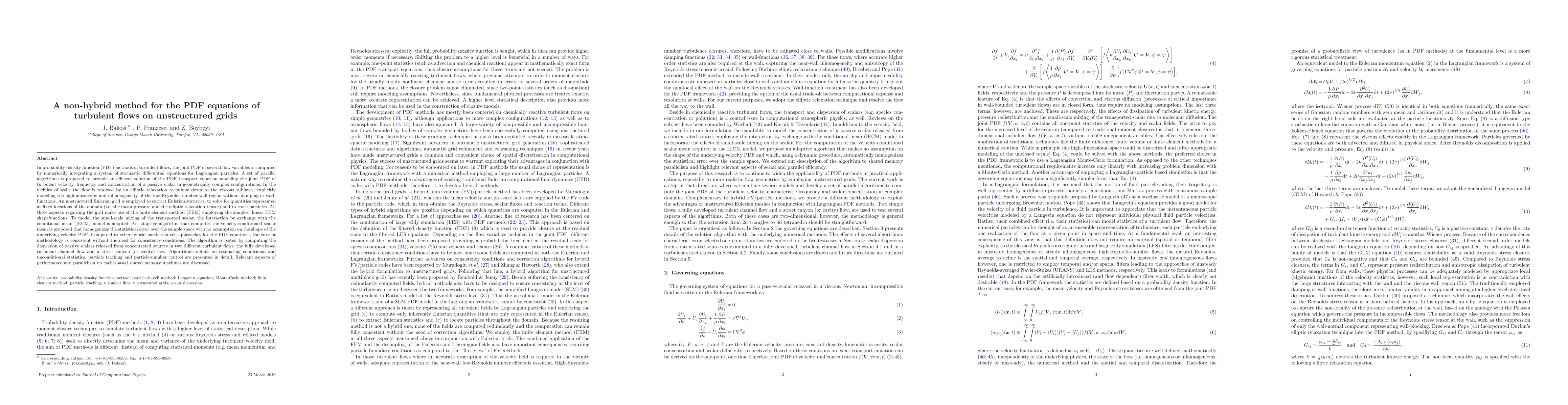 This paper proposes a non-hybrid method for solving the probability density function (PDF) equations of turbulent flows on unstructured grids using parallel algorithms and the finite element method (FEM). The method models the joint PDF of turbulent velocity, frequency, and concentration without hybrid particle-in-cell assumptions, and is tested on turbulent channel and street canyon flows.