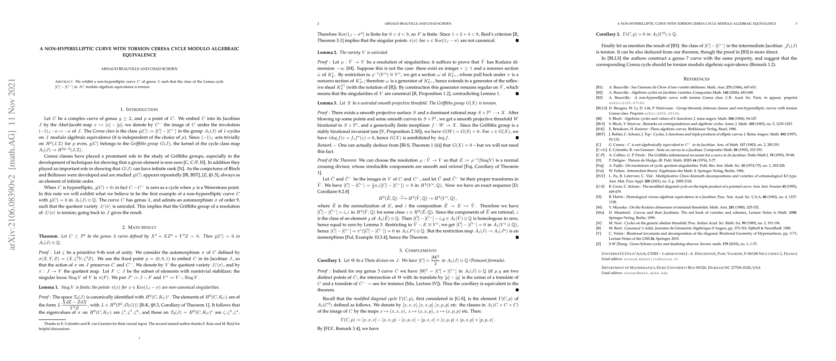 Researchers discovered a non-hyperelliptic curve of genus 3 with a Ceresa cycle that has torsion under algebraic equivalence, a key finding in the study of elliptic curves.