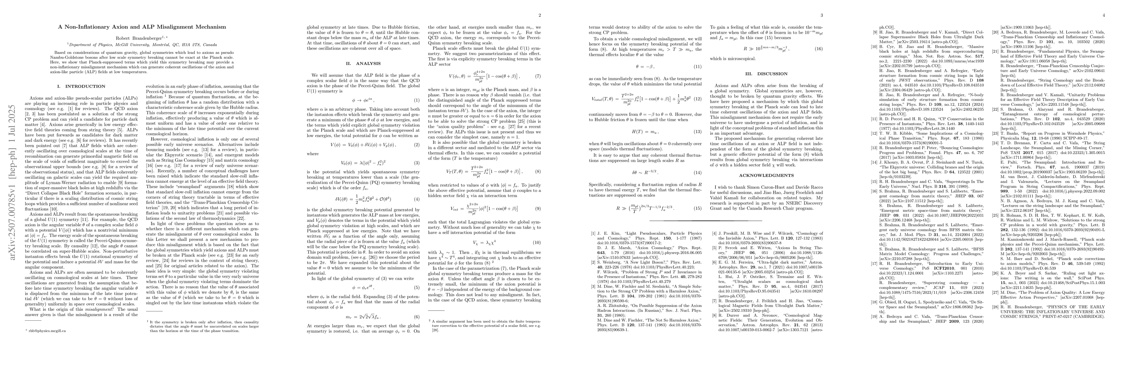 Based on considerations of quantum gravity, global symmetries which lead to axions as pseudo Nambu-Goldstone bosons after low scale symmetry breaking cannot be exact at the Planck scale. Here, we show that Planck-suppressed terms which yield this symmetry breaking may provide a non-inflationary misalignment mechanism which can generate coherent oscillations of the axion and axion-like particle (ALP) fields at low temperatures.
