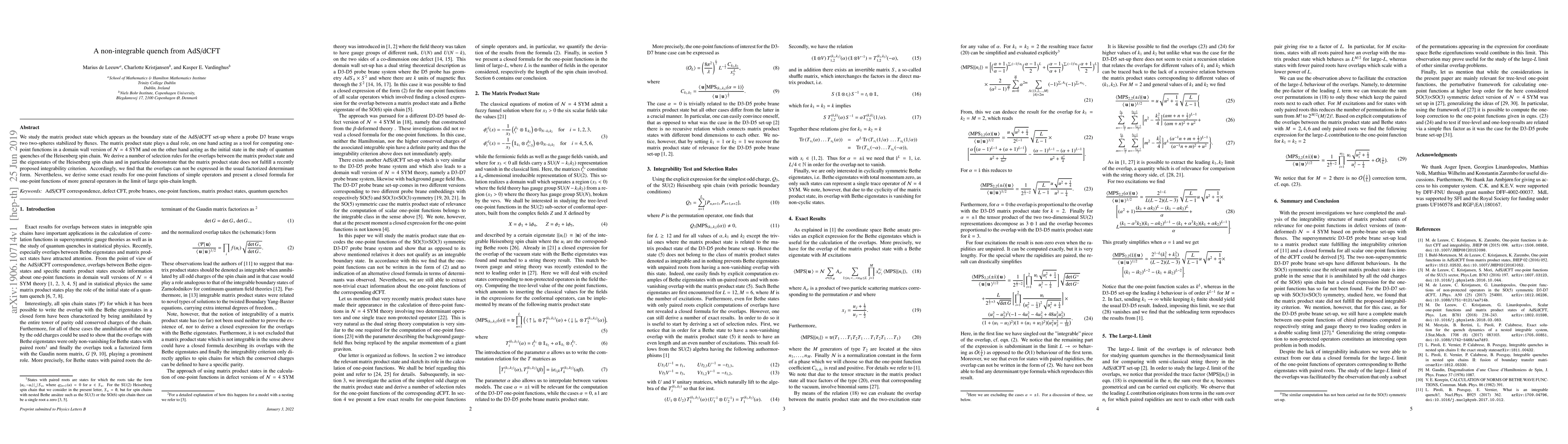 We study the matrix product state which appears as the boundary state of the AdS/dCFT set-up where a probe D7 brane wraps two two-spheres stabilized by fluxes. The matrix product state plays a dual role, on one hand acting as a tool for computing one-point functions in a domain wall version of N=4 SYM and on the other hand acting as the initial state in the study of quantum quenches of the Heisenberg spin chain. We derive a number of selection rules for the overlaps between the matrix product state and the eigenstates of the Heisenberg spin chain and in particular demonstrate that the matrix product state does not fulfill a recently proposed integrability criterion. Accordingly, we find that the overlaps can not be expressed in the usual factorized determinant form. Nevertheless, we derive some exact results for one-point functions of simple operators and present a closed formula for one-point functions of more general operators in the limit of large spin-chain length.