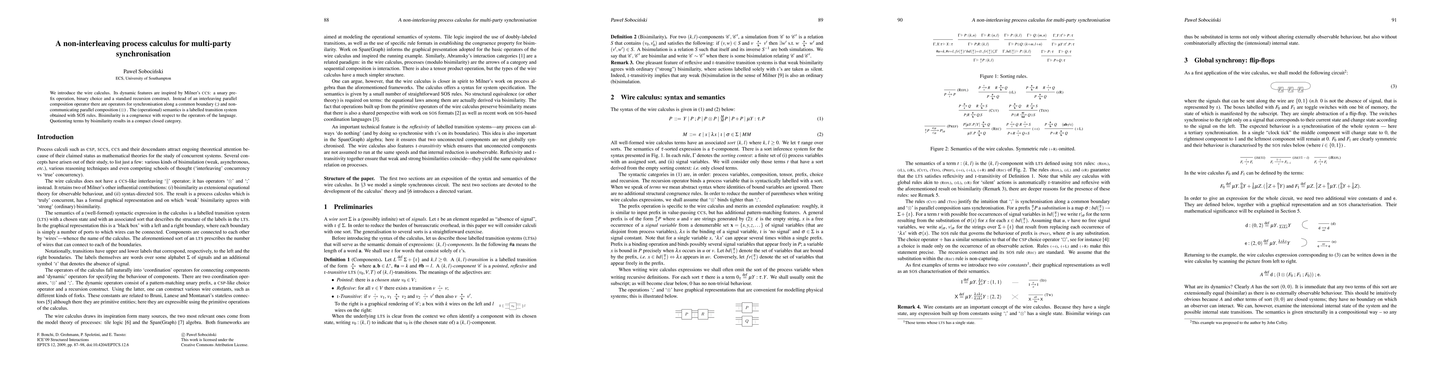 We introduce the wire calculus. Its dynamic features are inspired by Milner's CCS: a unary prefix operation, binary choice and a standard recursion construct. Instead of an interleaving parallel composition operator there are operators for synchronisation along a common boundary and non-communicating parallel composition. The (operational) semantics is a labelled transition system obtained with SOS rules. Bisimilarity is a congruence with respect to the operators of the language. Quotienting terms by bisimilarity results in a compact closed category.