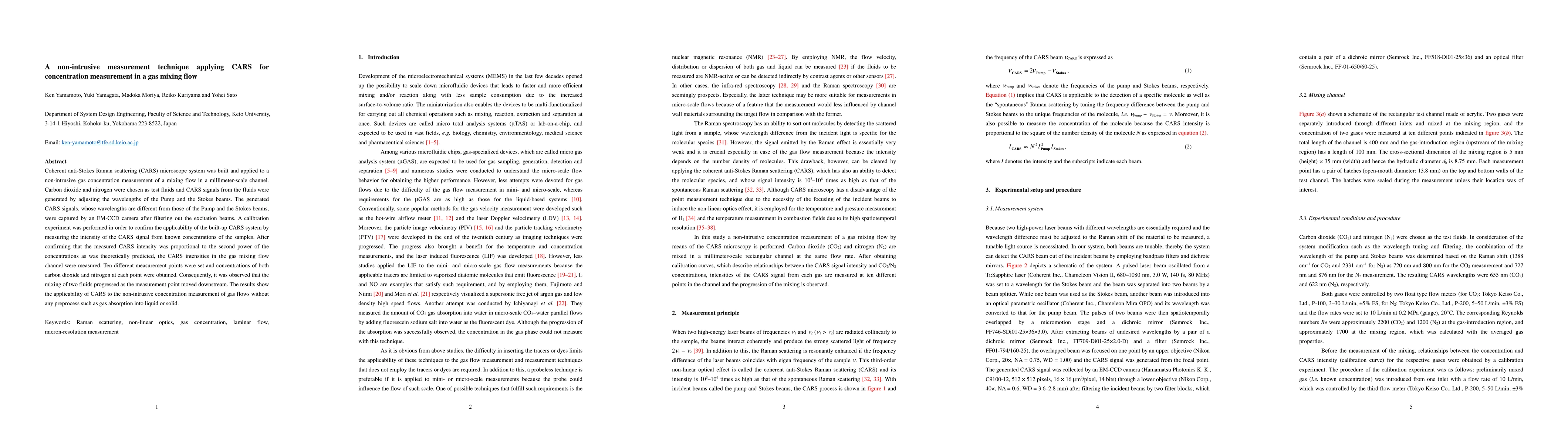 Coherent anti-Stokes Raman scattering (CARS) microscope system was built and applied to a non-intrusive gas concentration measurement of a mixing flow in a millimeter-scale channel. Carbon dioxide and nitrogen were chosen as test fluids and CARS signals from the fluids were generated by adjusting the wavelengths of the Pump and the Stokes beams. The generated CARS signals, whose wavelengths are different from those of the Pump and the Stokes beams, were captured by an EM-CCD camera after filtering out the excitation beams. A calibration experiment was performed in order to confirm the applicability of the built-up CARS system by measuring the intensity of the CARS signal from known concentrations of the samples. After confirming that the measured CARS intensity was proportional to the second power of the concentrations as was theoretically predicted, the CARS intensities in the gas mixing flow channel were measured. Ten different measurement points were set and concentrations of both carbon dioxide and nitrogen at each point were obtained. Consequently, it was observed that the mixing of two fluids progressed as the measurement point moved downstream. The results show the applicability of CARS to the non-intrusive concentration measurement of gas flows without any preprocess such as gas absorption into liquid or solid.
