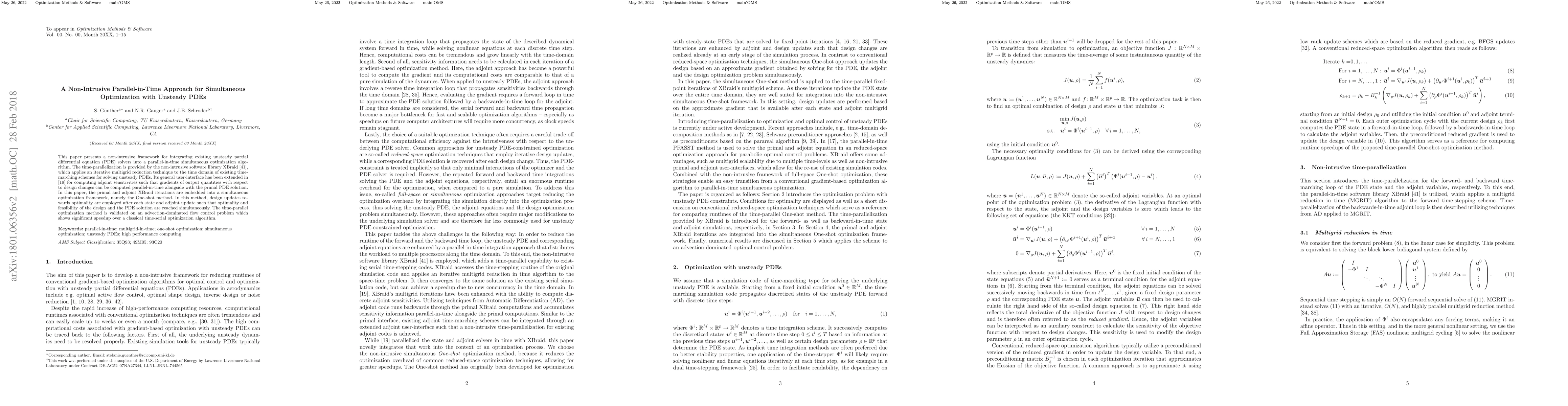 This paper introduces a non-intrusive parallel-in-time optimization framework using XBraid for solving unsteady PDEs, enabling simultaneous optimization and significant speedup compared to serial methods. The One-shot method is validated on an advection-dominated flow control problem.