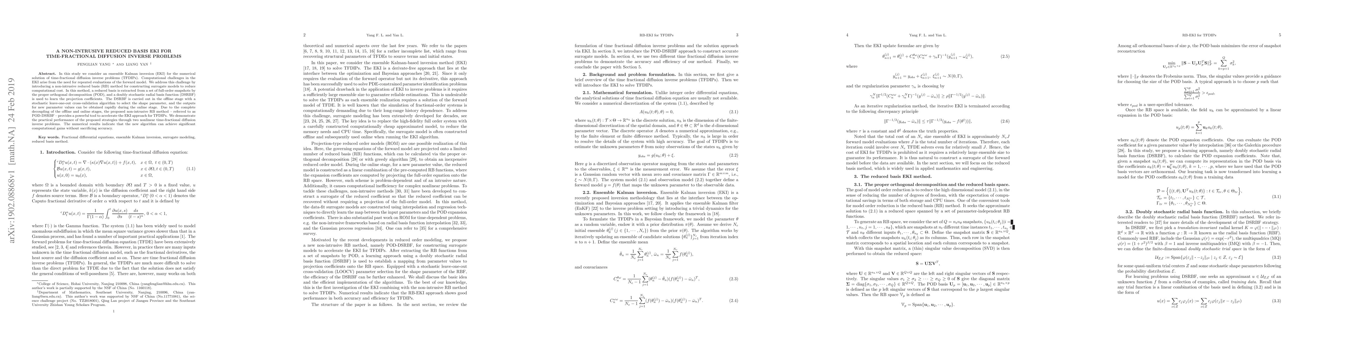 This paper proposes a non-intrusive reduced basis method, POD-DSRBF, to accelerate ensemble Kalman inversion for solving time-fractional diffusion inverse problems by reducing computational costs through surrogate models. The method uses proper orthogonal decomposition and doubly stochastic radial basis functions, achieving significant computational gains without compromising accuracy.