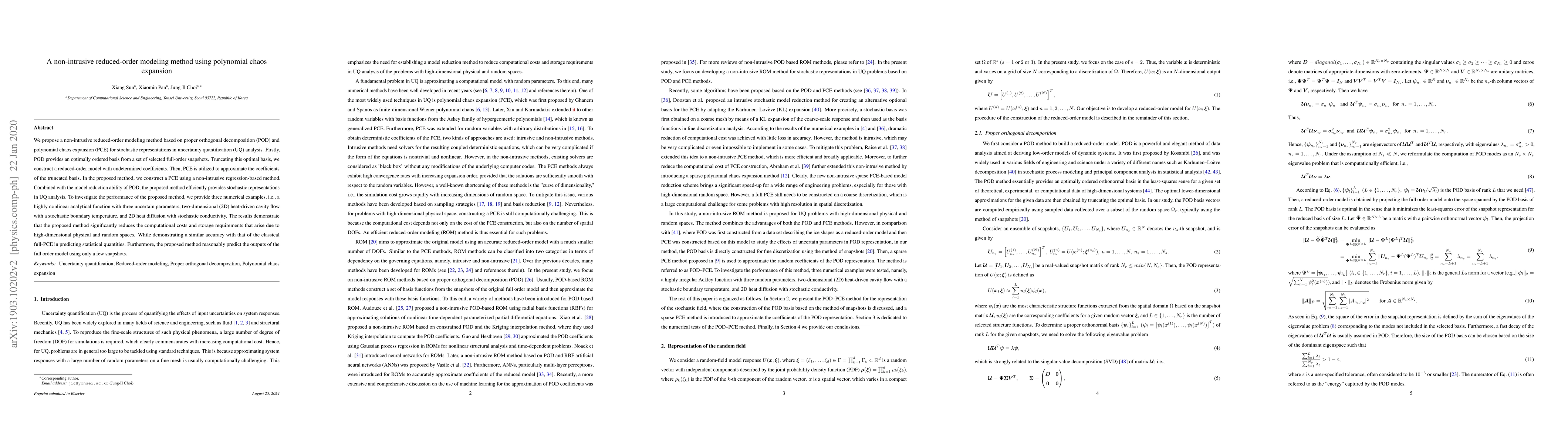 This paper introduces a non-intrusive reduced-order modeling method combining proper orthogonal decomposition (POD) and polynomial chaos expansion (PCE) for uncertainty quantification (UQ). It efficiently reduces computational costs and storage by approximating reduced-order model coefficients using a non-intrusive regression-based PCE, demonstrating accurate predictions with fewer snapshots.