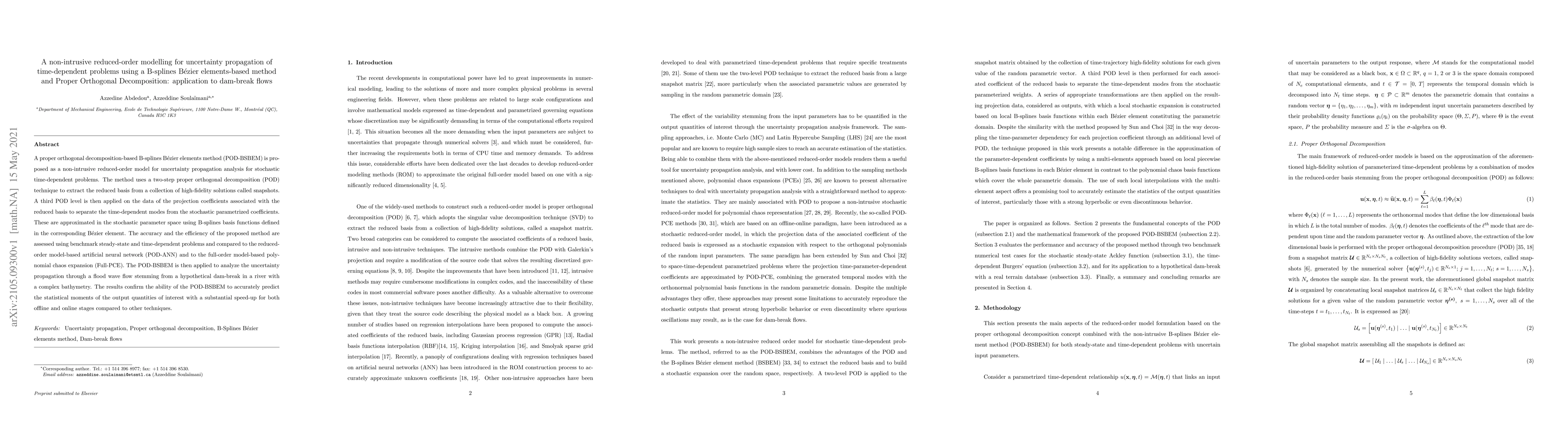 The paper proposes a non-intrusive reduced-order modelling method, POD-BSBEM, for uncertainty propagation in stochastic time-dependent problems using B-splines Bézier elements and Proper Orthogonal Decomposition. It demonstrates the method's efficiency and accuracy through a dam-break flow analysis, showing significant speed-ups compared to other techniques.