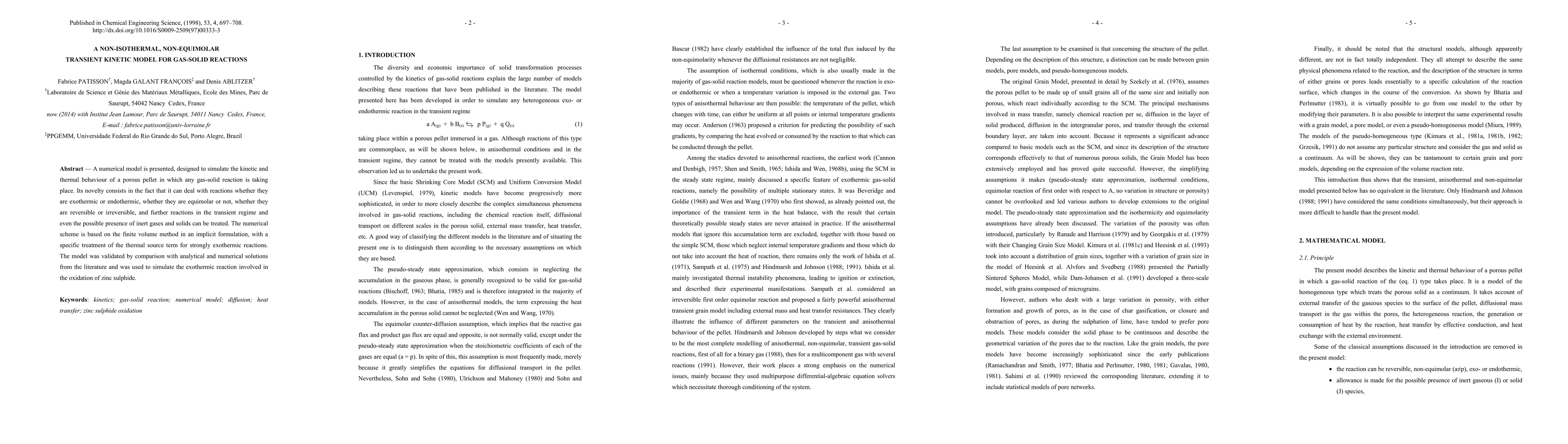 This paper introduces a non-isothermal, non-equimolar transient kinetic model for gas-solid reactions, capable of simulating various reaction types and conditions using a finite volume method. The model was validated and applied to simulate the exothermic oxidation of zinc sulphide.