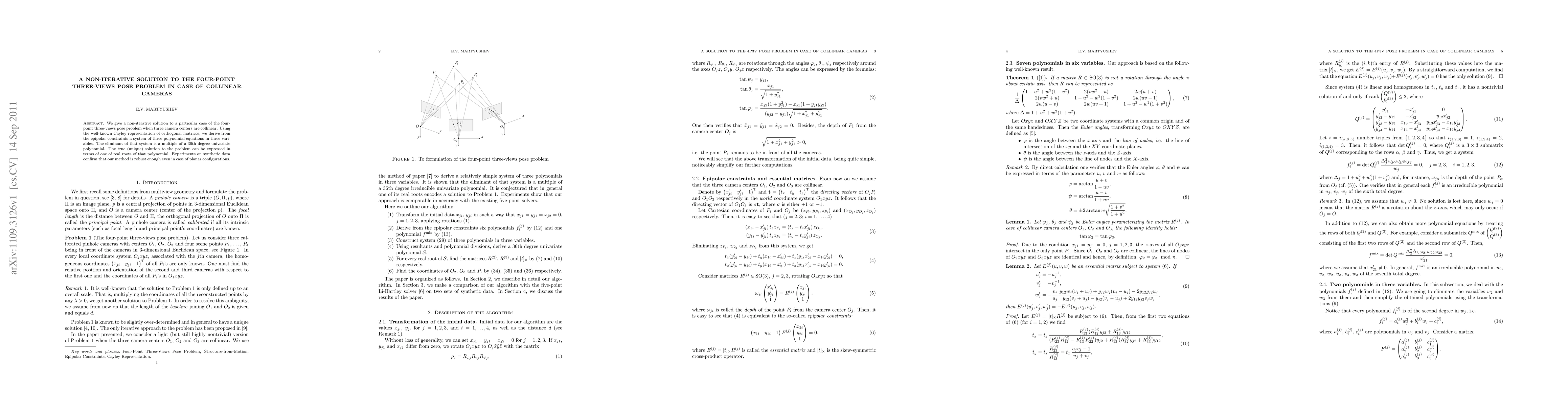 We give a non-iterative solution to a particular case of the four-point three-views pose problem when three camera centers are collinear. Using the well-known Cayley representation of orthogonal matrices, we derive from the epipolar constraints a system of three polynomial equations in three variables. The eliminant of that system is a multiple of a 36th degree univariate polynomial. The true (unique) solution to the problem can be expressed in terms of one of real roots of that polynomial. Experiments on synthetic data confirm that our method is robust enough even in case of planar configurations.