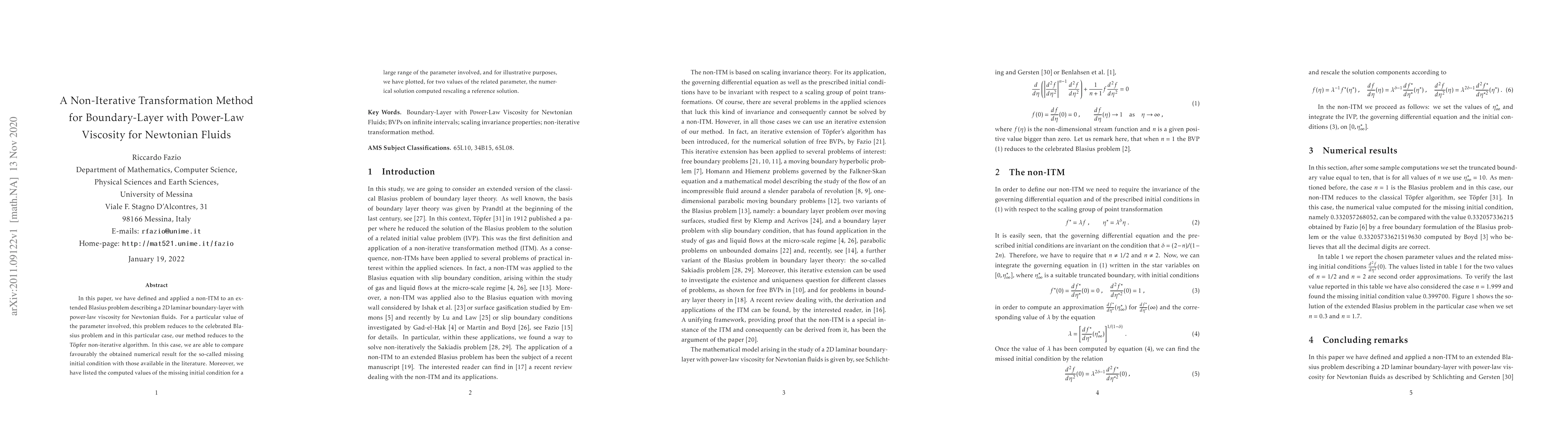 In this paper, we have defined and applied a non-ITM to an extended Blasius problem describing a 2D laminar boundary-layer with power-law viscosity for Newtonian fluids. For a particular value of the parameter involved, this problem reduces to the celebrated Blasius problem and in this particular case, our method reduces to the T\"opfer non-iterative algorithm. In this case, we are able to compare favourably the obtained numerical result for the so-called missing initial condition with those available in the literature. Moreover, we have listed the computed values of the missing initial condition for a large range of the parameter involved, and for illustrative purposes, we have plotted, for two values of the related parameter, the numerical solution computed rescaling a reference solution.