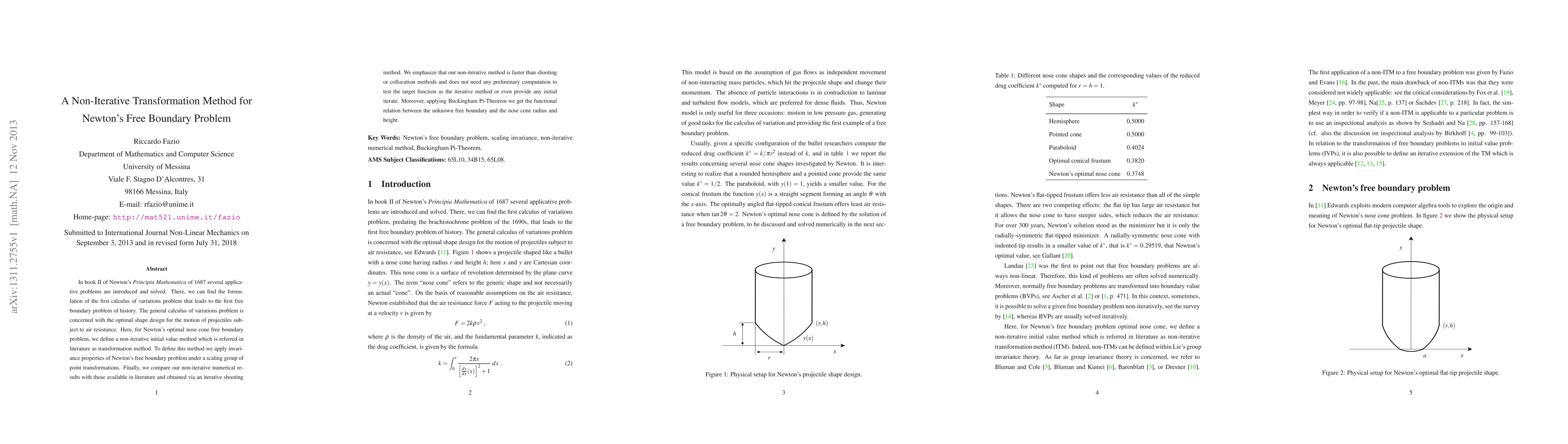 In book II of Newton's "Principia Mathematica" of 1687 several applicative problems are introduced and solved. There, we can find the formulation of the first calculus of variations problem that leads to the first free boundary problem of history. The general calculus of variations problem is concerned with the optimal shape design for the motion of projectiles subject to air resistance. Here, for Newton's optimal nose cone free boundary problem, we define a non-iterative initial value method which is referred in literature as transformation method. To define this method we apply invariance properties of Newton's free boundary problem under a scaling group of point transformations. Finally, we compare our non-iterative numerical results with those available in literature and obtained via an iterative shooting method. We emphasize that our non-iterative method is faster than shooting or collocation methods and does not need any preliminary computation to test the target function as the iterative method or even provide any initial iterate. Moreover, applying Buckingham Pi-Theorem we get the functional relation between the unknown free boundary and the nose cone radius and height.
