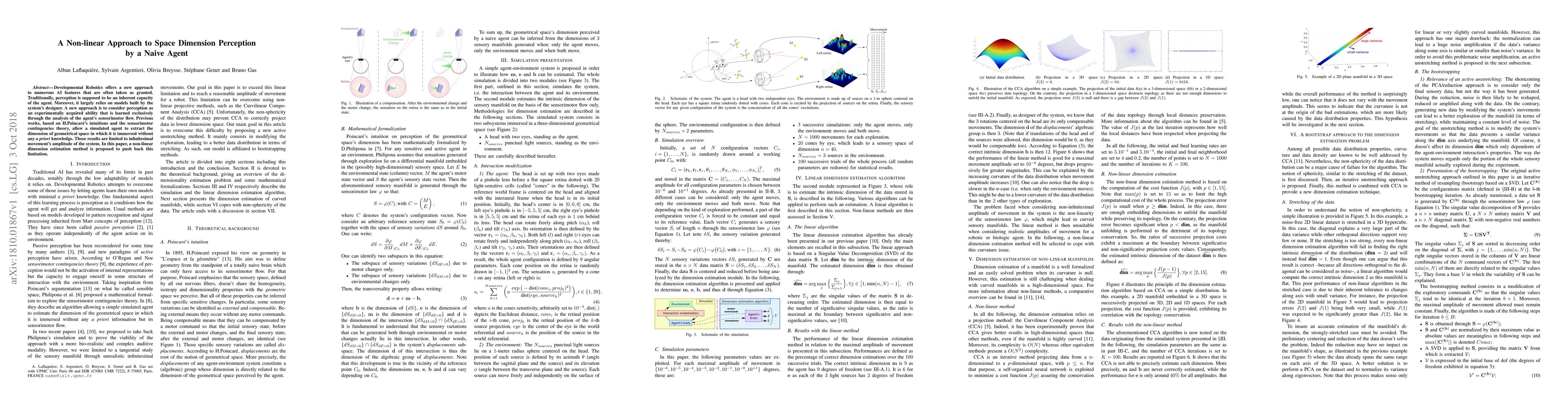 Developmental Robotics offers a new approach to numerous AI features that are often taken as granted. Traditionally, perception is supposed to be an inherent capacity of the agent. Moreover, it largely relies on models built by the system's designer. A new approach is to consider perception as an experimentally acquired ability that is learned exclusively through the analysis of the agent's sensorimotor flow. Previous works, based on H.Poincar\'e's intuitions and the sensorimotor contingencies theory, allow a simulated agent to extract the dimension of geometrical space in which it is immersed without any a priori knowledge. Those results are limited to infinitesimal movement's amplitude of the system. In this paper, a non-linear dimension estimation method is proposed to push back this limitation.