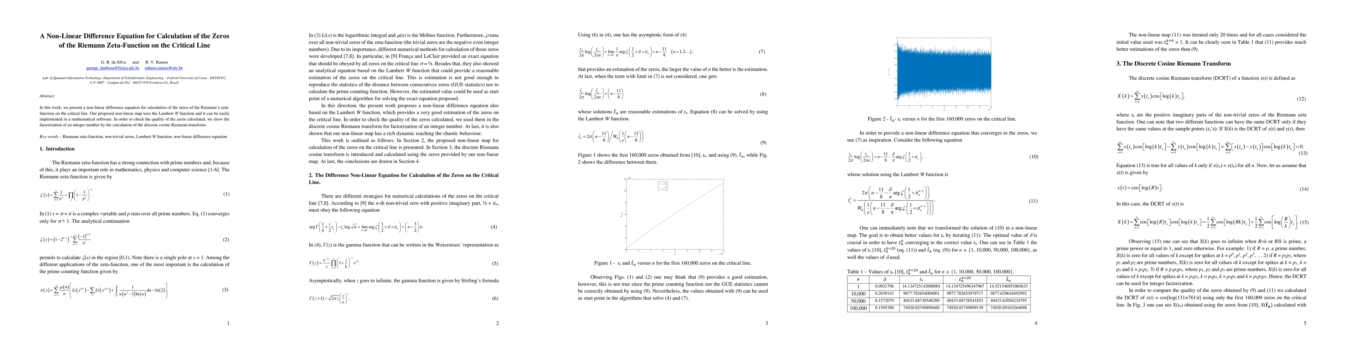 In this work, we present a non-linear difference equation for calculation of the zeros of the Riemann's zeta-function on the critical line. Our proposed non-linear map uses the Lambert W function and it can be easily implemented in a mathematical software. In order to check the quality of the zeros calculated, we show the factorization of an integer number by the calculation of the discrete cosine Riemann transform.