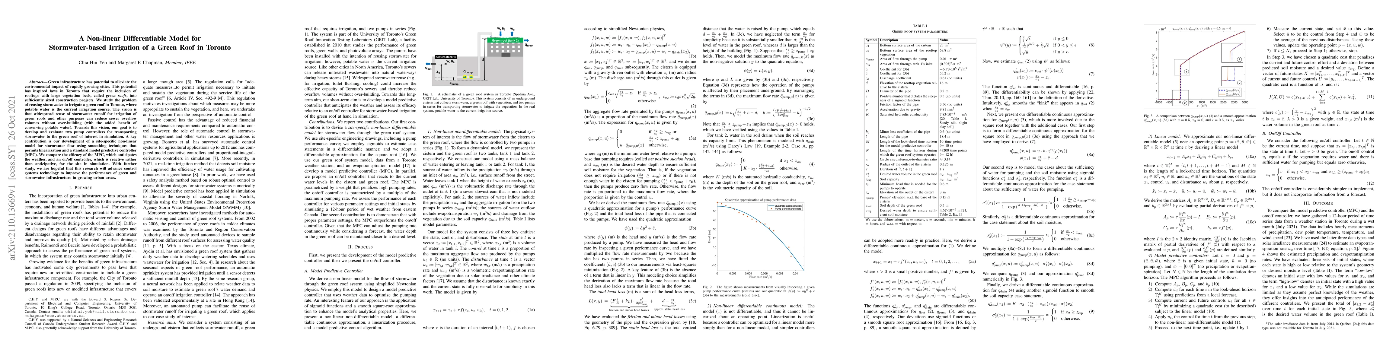 This paper develops a non-linear differentiable model for stormwater-based irrigation of green roofs in Toronto, aiming to reduce sewer overflow and conserve potable water. It evaluates two pump controllers, comparing a predictive controller that anticipates weather with a reactive on/off controller, to optimize stormwater reuse.