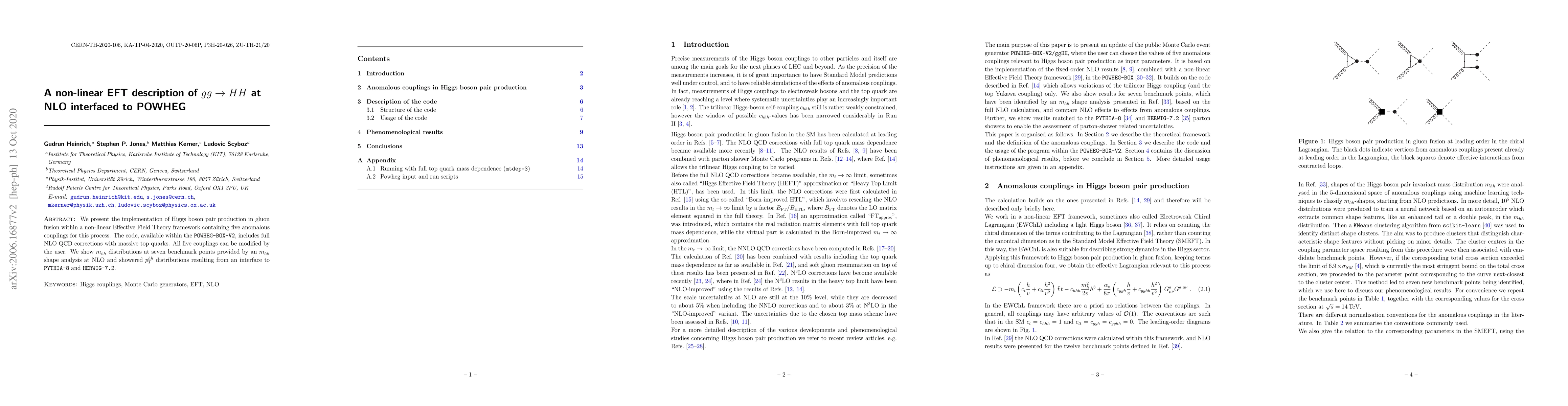 We present the implementation of Higgs boson pair production in gluon fusion within a non-linear Effective Field Theory framework containing five anomalous couplings for this process. The code, available within the POWHEG-BOX-V2, includes full NLO QCD corrections with massive top quarks. All five couplings can be modified by the user. We show $m_{hh}$ distributions at seven benchmark points provided by an $m_{hh}$ shape analysis at NLO and showered $p_T^{hh}$ distributions resulting from an interface to Pythia-8 and Herwig-7.2.