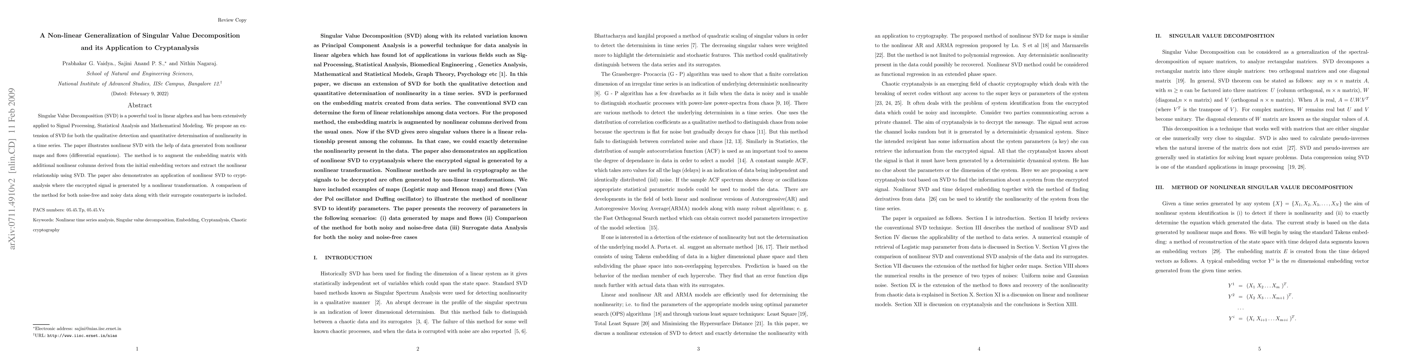 This paper proposes a non-linear generalization of Singular Value Decomposition to detect and determine nonlinearity in time series data, with applications in cryptanalysis.