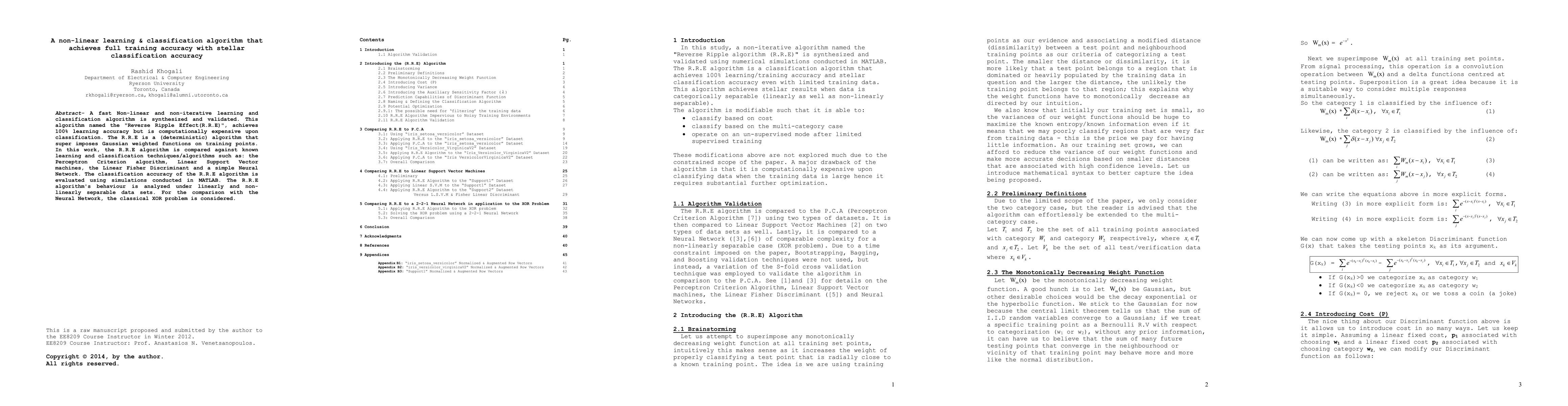 A fast Non-linear and non-iterative learning and classification algorithm is synthesized and validated. This algorithm named the "Reverse Ripple Effect(R.R.E)", achieves 100% learning accuracy but is computationally expensive upon classification. The R.R.E is a (deterministic) algorithm that super imposes Gaussian weighted functions on training points. In this work, the R.R.E algorithm is compared against known learning and classification techniques/algorithms such as: the Perceptron Criterion algorithm, Linear Support Vector machines, the Linear Fisher Discriminant and a simple Neural Network. The classification accuracy of the R.R.E algorithm is evaluated using simulations conducted in MATLAB. The R.R.E algorithm's behaviour is analyzed under linearly and non-linearly separable data sets. For the comparison with the Neural Network, the classical XOR problem is considered.