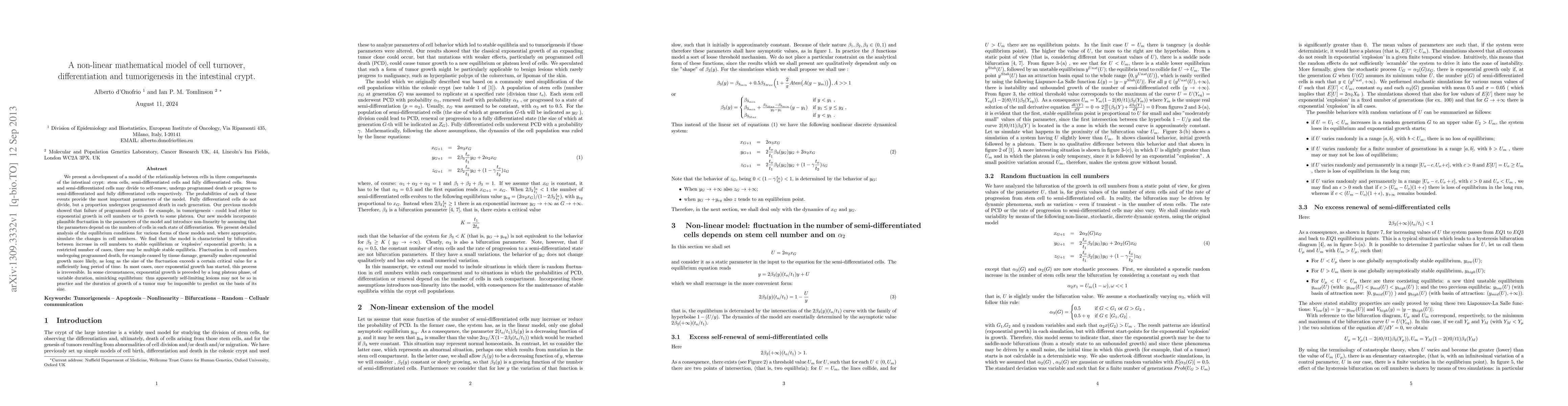 This paper develops a non-linear mathematical model to describe cell turnover, differentiation, and tumorigenesis in the intestinal crypt, showing that fluctuations in programmed death can lead to exponential growth or stable equilibria, with irreversible growth once initiated. The model reveals potential for multiple stable states and self-limiting lesions that may not be truly stable.