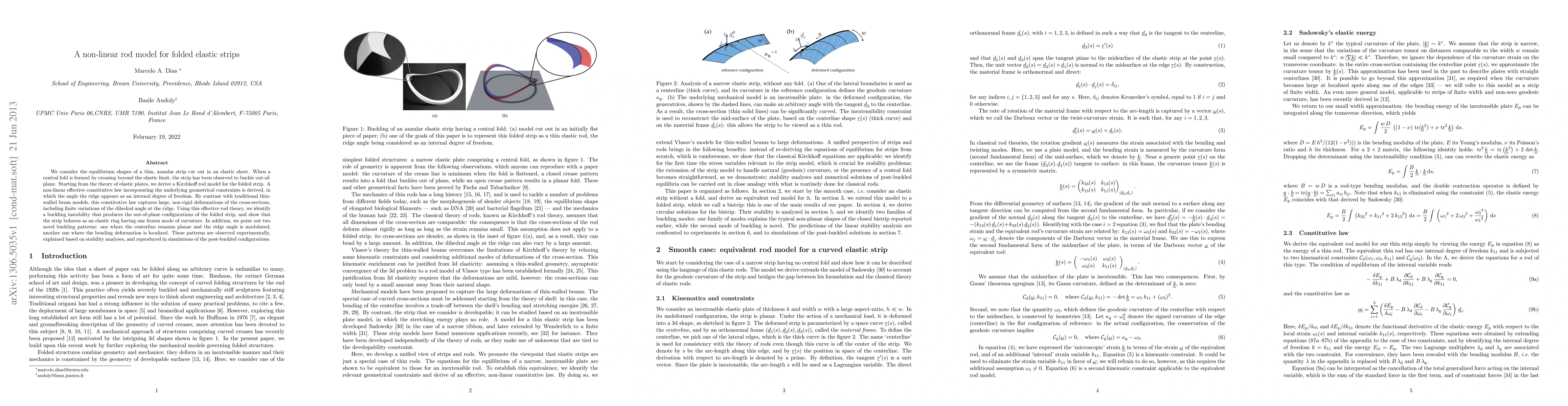 This paper develops a non-linear rod model for folded elastic strips, deriving an effective constitutive law that captures large deformations and finite variations in the dihedral angle. The model identifies buckling instabilities leading to out-of-plane configurations and novel buckling patterns, validated through experimental observations and simulations.