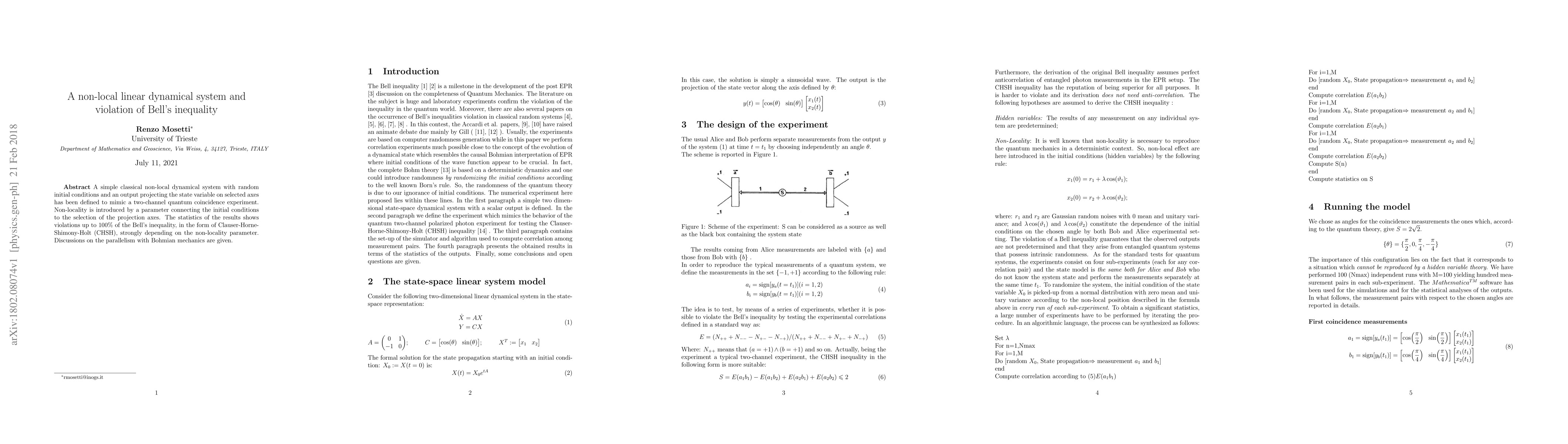 A simple classical non-local dynamical system with random initial conditions and an output projecting the state variable on selected axes has been defined to mimic a two-channel quantum coincidence experiment. Non-locality is introduced by a parameter connecting the initial conditions to the selection of the projection axes. The statistics of the results shows violations up to 100% of the Bell's inequality, in the form of Clauser-Horne- Shimony-Holt (CHSH), strongly depending on the non-locality parameter. Discussions on the parallelism with Bohmian mechanics are given.