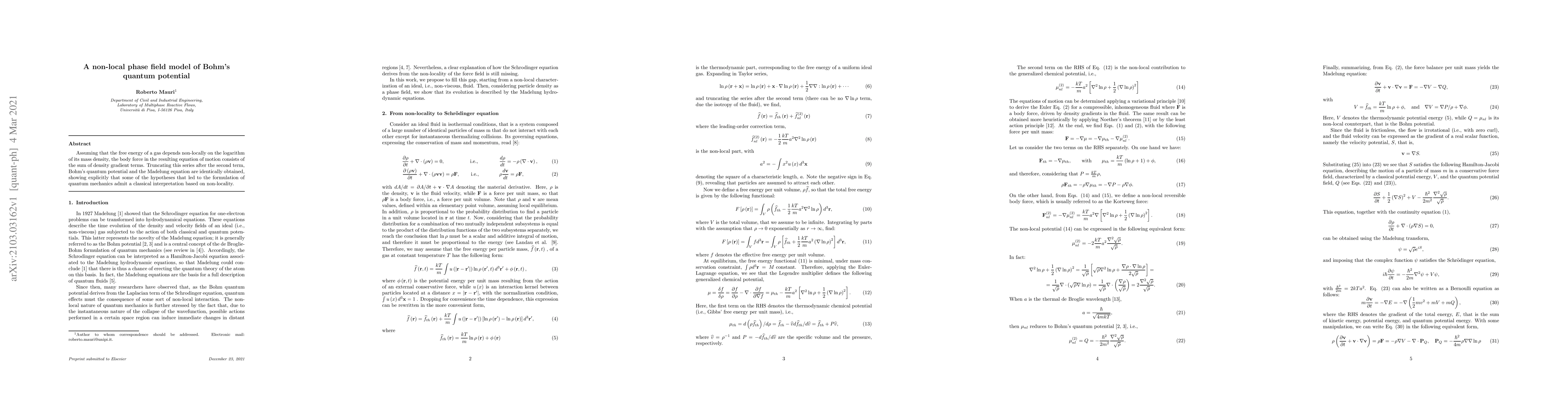 This paper proposes a non-local phase field model where the free energy of a gas depends on the logarithm of its mass density, leading to a body force that includes density gradient terms. By truncating the series after the second term, the model reproduces Bohm's quantum potential and the Madelung equation, suggesting a classical interpretation of quantum mechanics through non-locality.