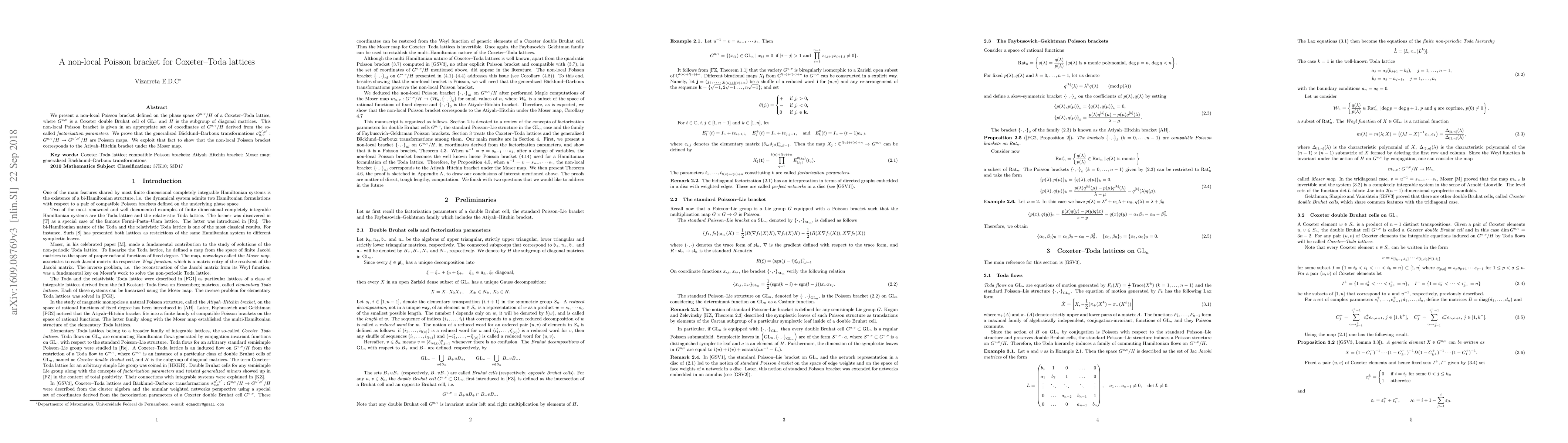 This paper introduces a non-local Poisson bracket on the phase space of a Coxeter-Toda lattice, defined via factorization parameters, and demonstrates that generalized Bäcklund-Darboux transformations are Poisson maps, linking it to the Atiyah-Hitchin bracket.