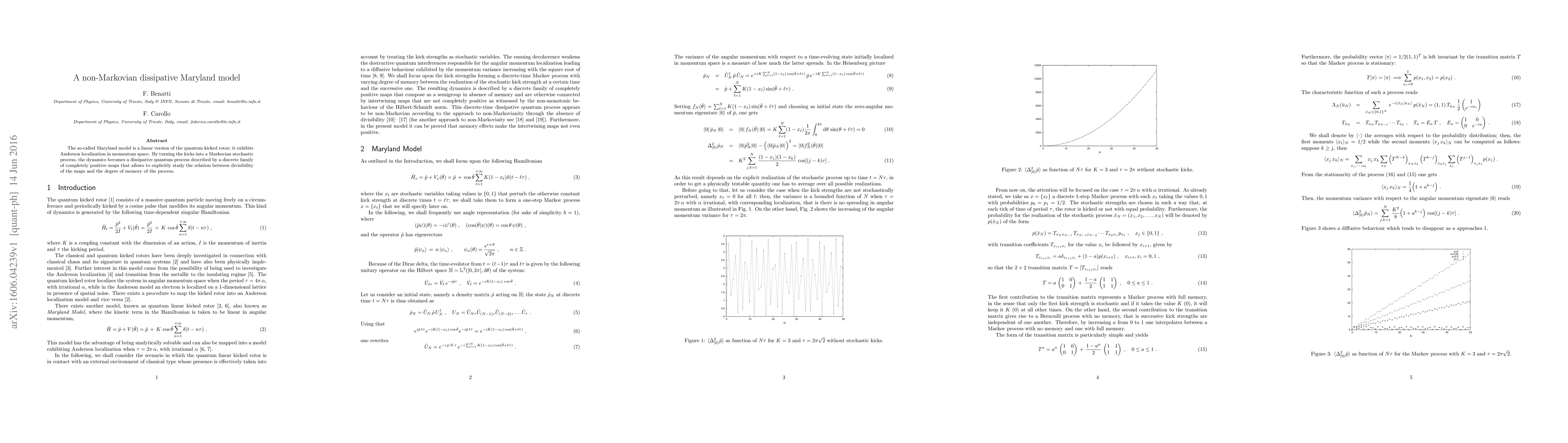 The so-called Maryland model is a linear version of the quantum kicked rotor; it exhibits Anderson localization in momentum space. By turning the kicks into a Markovian stochastic process, the dynamics becomes a dissipative quantum process described by a discrete family of completely positive maps that allows to explicitly study the relation between divisibility of the maps and the degree of memory of the process.