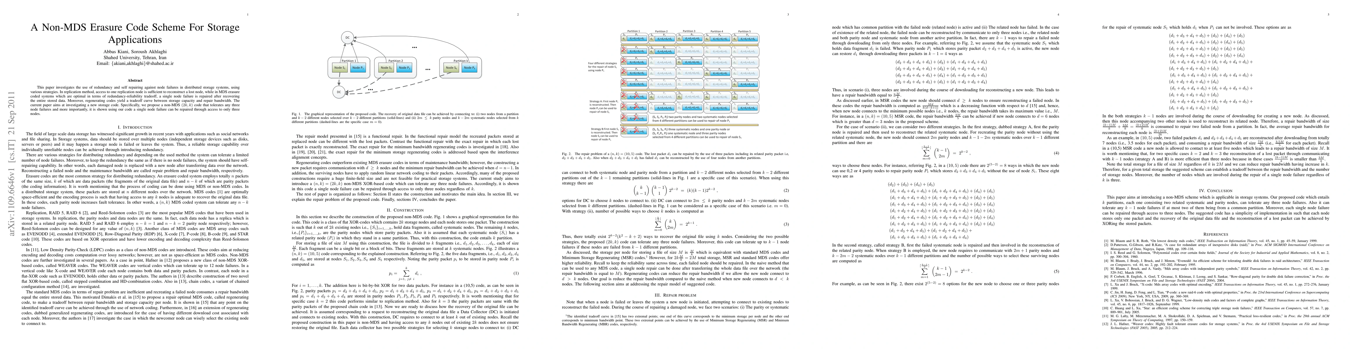 This paper proposes a new non-MDS (2k, k) erasure code for storage applications that can tolerate up to three node failures and allows for repairing a single node failure by accessing only three nodes, improving efficiency over traditional MDS codes.