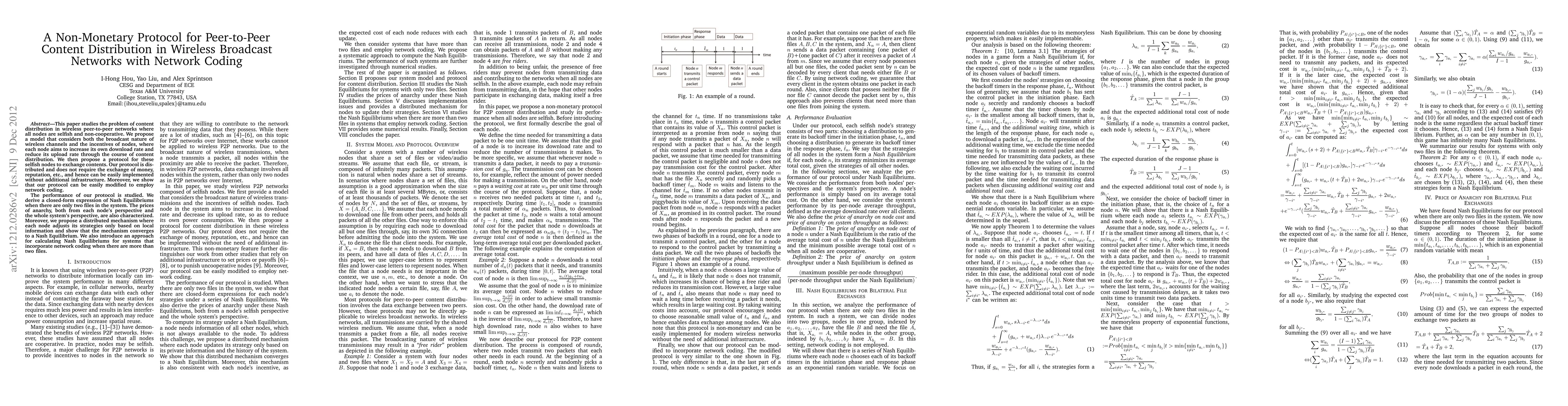 This paper proposes a non-monetary protocol for content distribution in selfish wireless peer-to-peer networks, leveraging network coding. It derives Nash Equilibriums and analyzes the prices of anarchy, demonstrating a distributed mechanism that converges to equilibrium using local information.