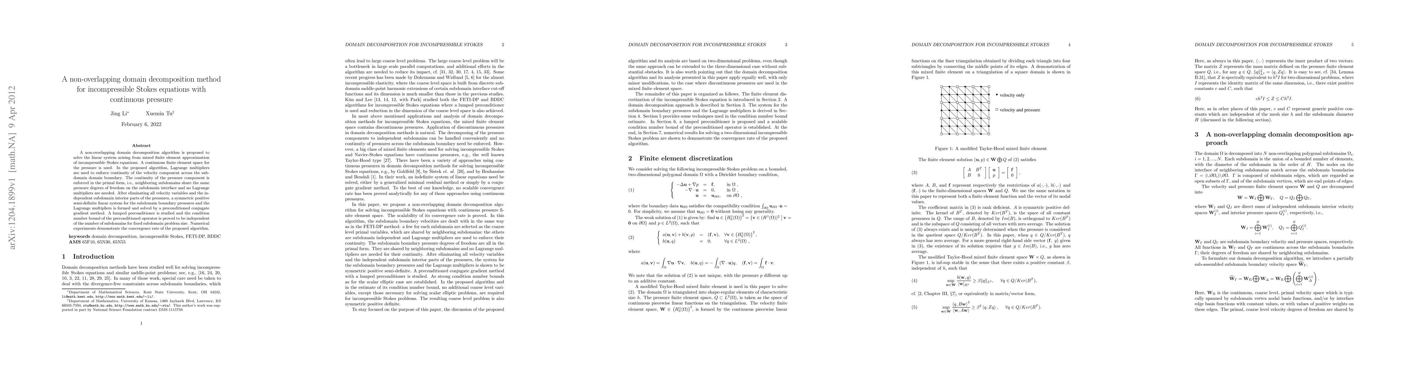 This paper proposes a non-overlapping domain decomposition method for solving incompressible Stokes equations using mixed finite element approximation. The algorithm enforces continuity of velocity via Lagrange multipliers and pressure directly through shared degrees of freedom, leading to a preconditioned conjugate gradient solution for boundary pressures and multipliers.
