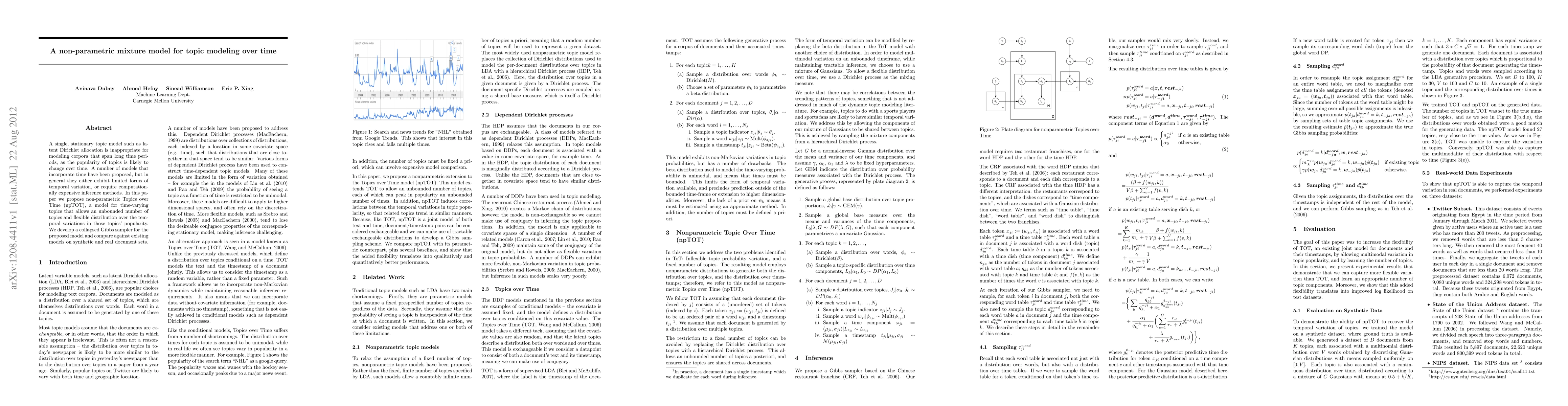 A new non-parametric model called non-parametric Topics over Time (npTOT) is proposed to analyze changing topic popularity over time without requiring complex inference methods. The model was compared against existing models on synthetic and real document sets, showing its effectiveness in capturing temporal variations.