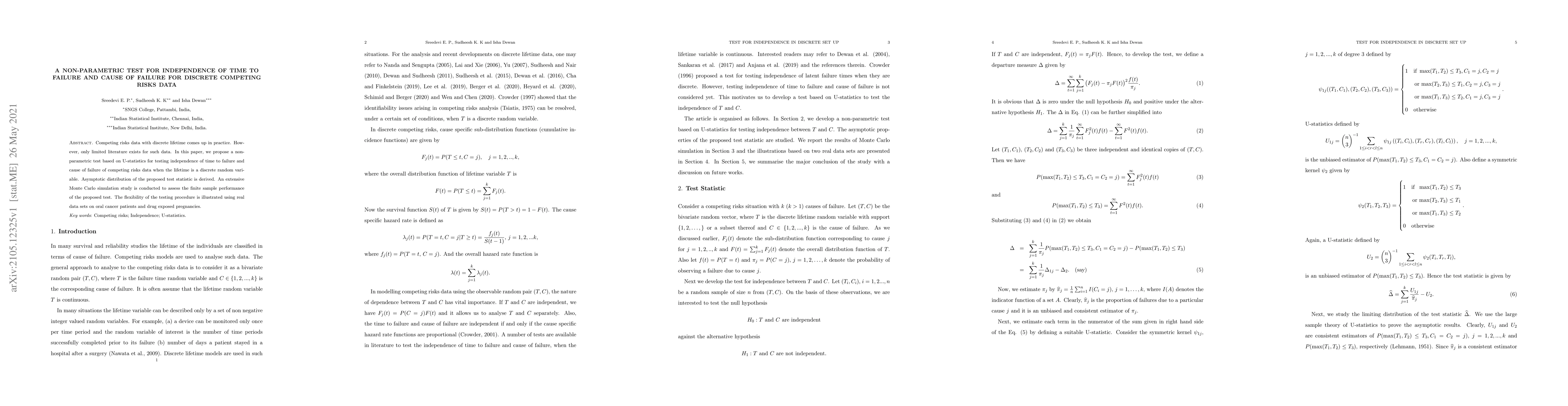 This paper proposes a non-parametric test based on U-statistics to assess the independence between time to failure and cause of failure in discrete competing risks data. The asymptotic distribution of the test statistic is derived, and its performance is evaluated through Monte Carlo simulations and demonstrated using real datasets.