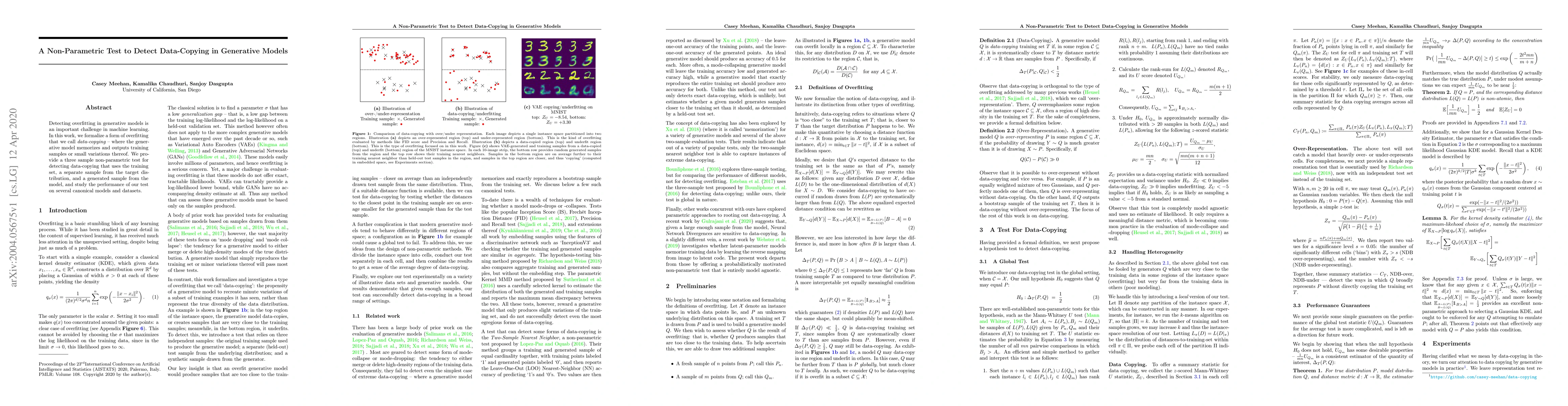 This paper introduces a non-parametric test to detect data-copying in generative models, a form of overfitting where the model memorizes training samples. The test uses training, target, and generated samples, and evaluates its performance on various models and datasets. For implementation details, see the code on GitHub.