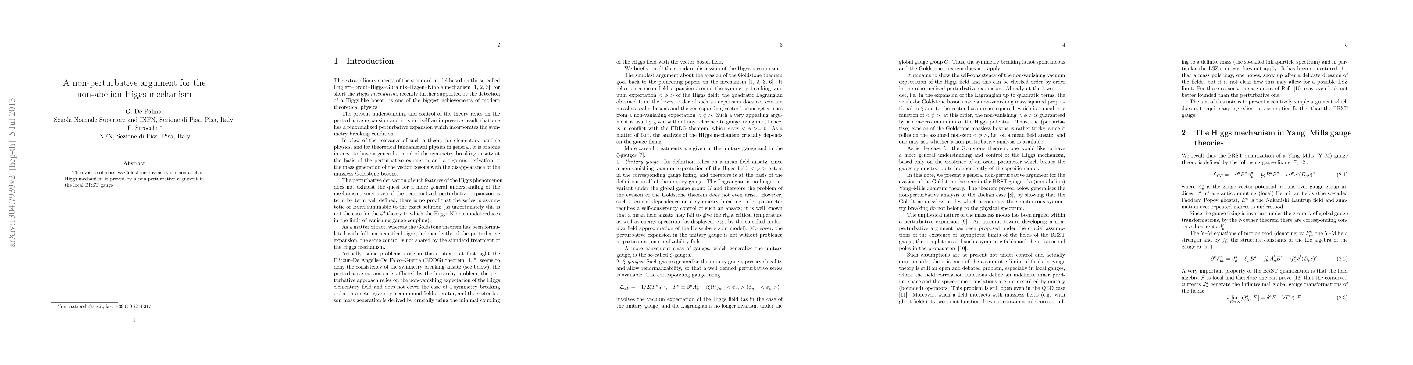 Summary: This paper provides a non-perturbative proof of the non-abelian Higgs mechanism, demonstrating how it prevents the appearance of massless Goldstone bosons through a local BRST gauge approach.