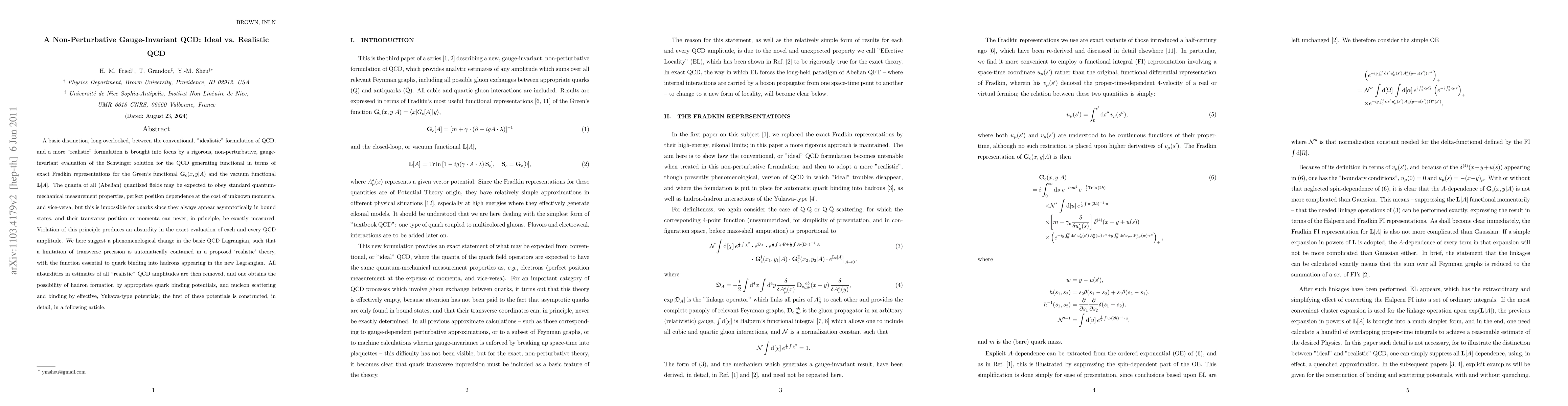 A basic distinction, long overlooked, between the conventional, "idealistic" formulation of QCD, and a more "realistic" formulation is brought into focus by a rigorous, non-perturbative, gauge-invariant evaluation of the Schwinger solution for the QCD generating functional in terms of exact Fradkin representations for the Green's functional $\mathbf{G}_{c}(x,y|A)$ and the vacuum functional $\mathbf{L}[A]$. The quanta of all (Abelian) quantized fields may be expected to obey standard quantum-mechanical measurement properties, perfect position dependence at the cost of unknown momenta, and vice-versa, but this is impossible for quarks since they always appear asymptotically in bound states, and their transverse position or momenta can never, in principle, be exactly measured. Violation of this principle produces an absurdity in the exact evaluation of each and every QCD amplitude. We here suggest a phenomenological change in the basic QCD Lagrangian, such that a limitation of transverse precision is automatically contained in the now "realistic" theory, with the function essential to quark binding into hadrons appearing in the new Lagrangian. All absurdities in estimates of all "realistic" QCD amplitudes are then removed, and one obtains the possibility of hadron formation by appropriate quark binding potentials, and nucleon scattering and binding by effective, Yukawa-type potentials; the first of these potentials are constructed, in detail, in the following paper.