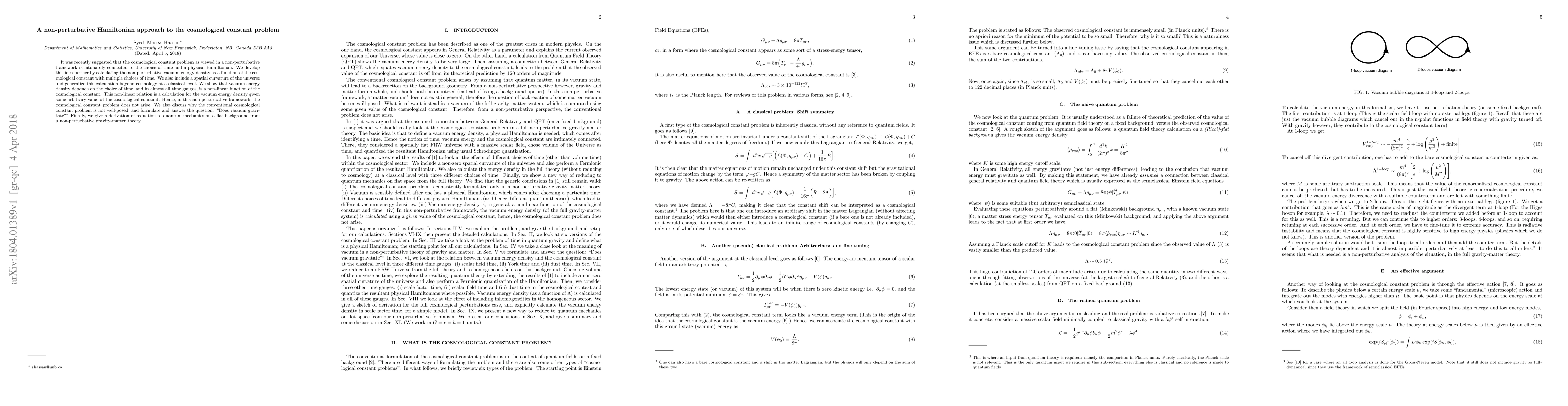 This paper explores the cosmological constant problem using a non-perturbative Hamiltonian approach, demonstrating that vacuum energy density is a non-linear function of the cosmological constant, thus resolving the problem in this framework. The study also addresses the question of whether vacuum gravitates and derives quantum mechanics from a non-perturbative gravity-matter theory.