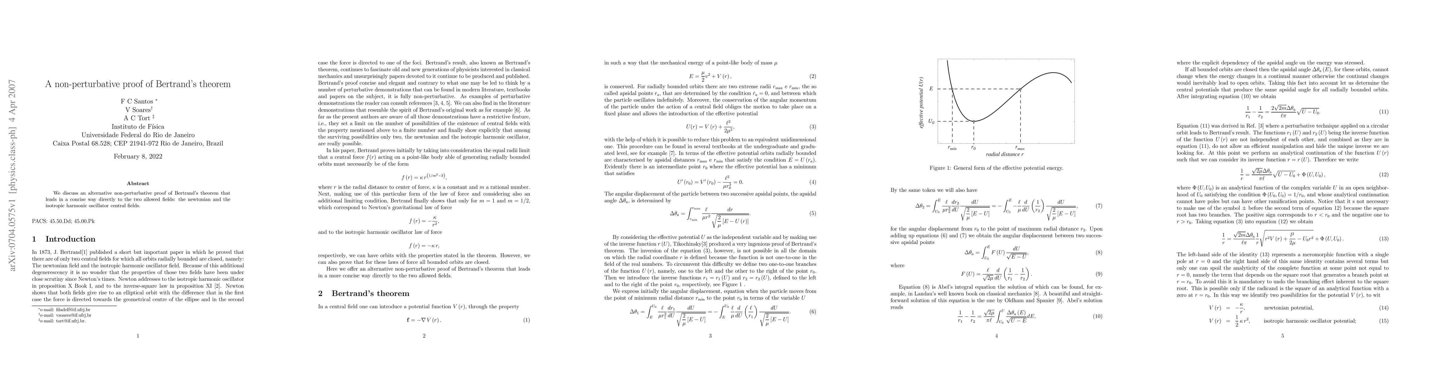 We discuss an alternative non-perturbative proof of Bertrand's theorem that leads in a concise way directly to the two allowed fields: the newtonian and the isotropic harmonic oscillator central fields.