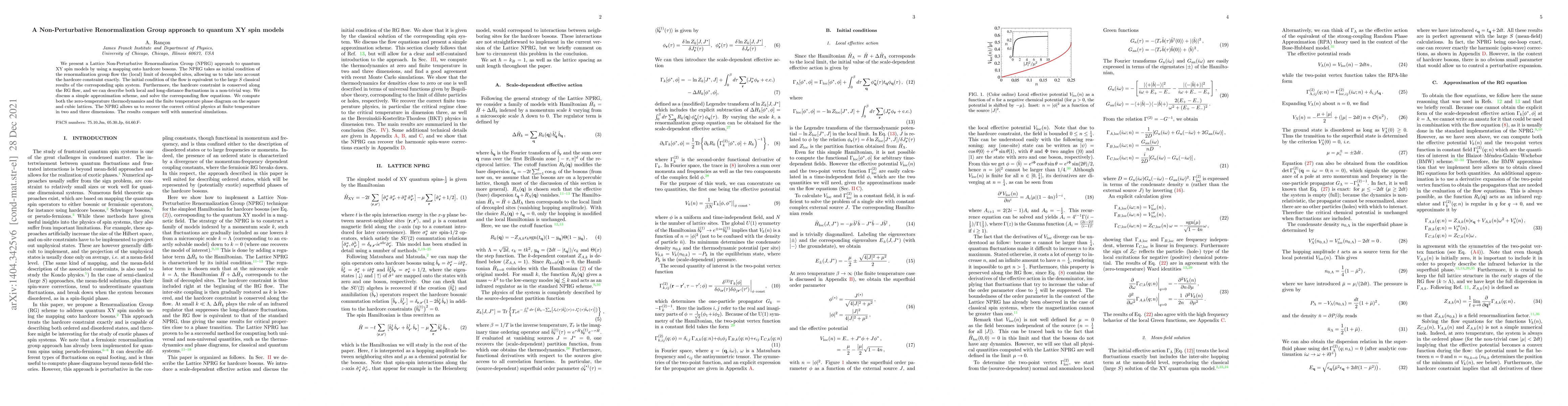 This paper introduces a Lattice Non-Perturbative Renormalization Group (NPRG) approach to quantum XY spin models, mapping them onto hardcore bosons to account for constraints accurately. The method recovers critical physics and compares favorably with numerical simulations, providing insights into zero-temperature thermodynamics and finite-temperature phase diagrams.
