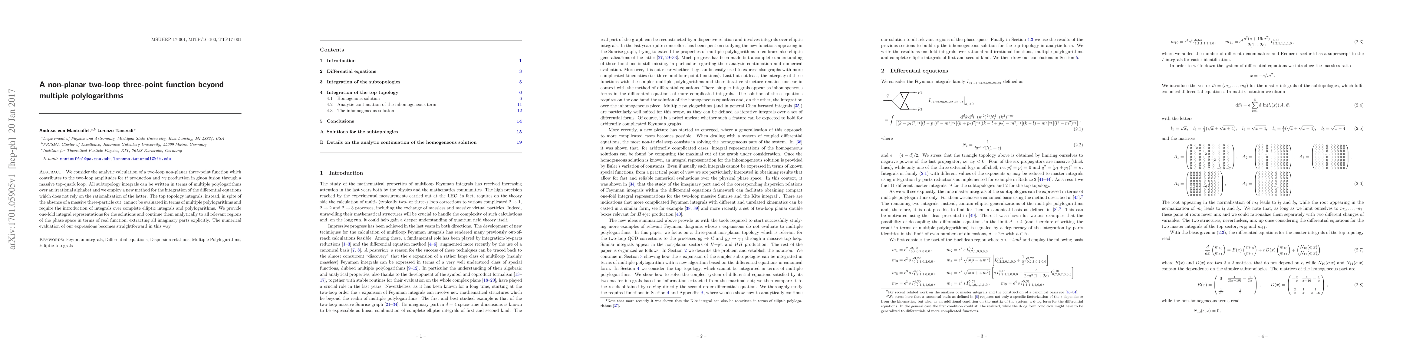 This paper calculates a non-planar two-loop three-point function for $t \bar{t}$ and $\gamma \gamma$ production, finding that subtopology integrals are expressible in terms of multiple polylogarithms. The top topology integrals, however, require integration over complete elliptic integrals and polylogarithms, with analytical continuation and explicit extraction of imaginary parts for numerical evaluation.
