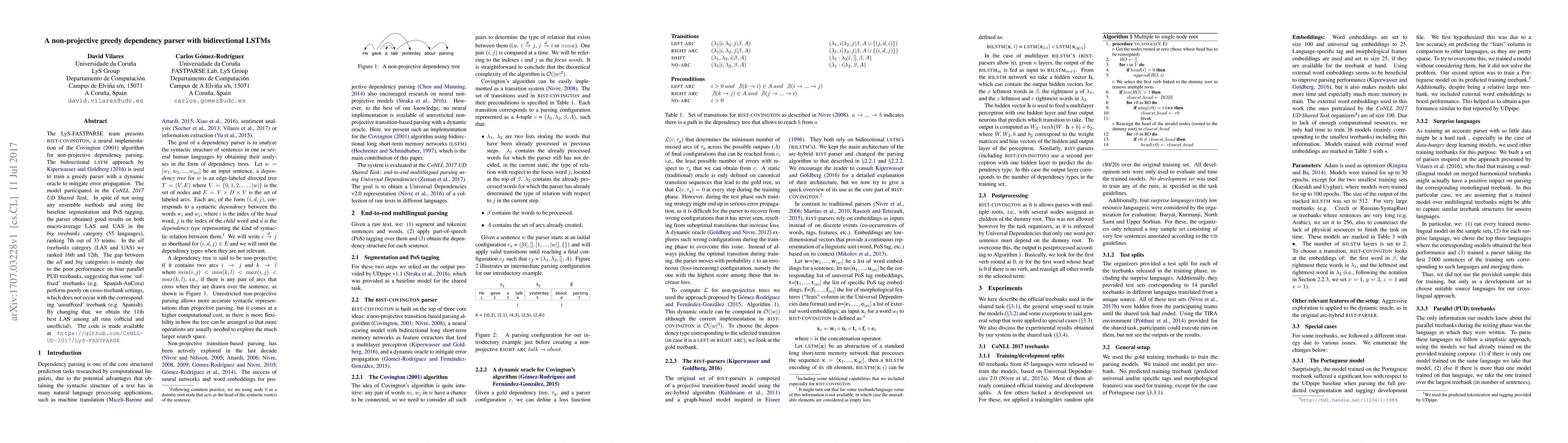 Researchers presented a non-projective greedy dependency parser that achieved good results on several treebanks, ranking 7th in the CoNLL 2017 UD Shared Task, despite not using ensemble methods or basing segmentation and POS tagging on baseline models.