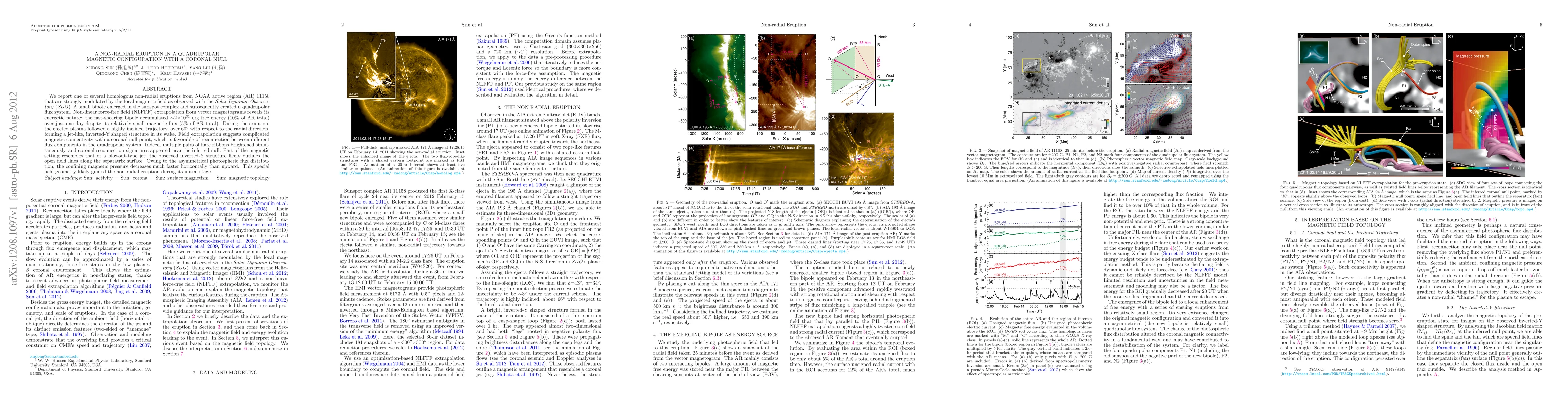 We report one of several homologous non-radial eruptions from NOAA active region (AR) 11158 that are strongly modulated by the local magnetic field as observed with the Solar Dynamic Observatory (SDO). A small bipole emerged in the sunspot complex and subsequently created a quadrupolar flux system. Non-linear force-free field (NLFFF) extrapolation from vector magnetograms reveals its energetic nature: the fast-shearing bipole accumulated ~2e31 erg free energy (10% of AR total) over just one day despite its relatively small magnetic flux (5% of AR total). During the eruption, the ejected plasma followed a highly inclined trajectory, over 60 degrees with respect to the radial direction, forming a jet-like, inverted-Y shaped structure in its wake. Field extrapolation suggests complicated magnetic connectivity with a coronal null point, which is favorable of reconnection between different flux components in the quadrupolar system. Indeed, multiple pairs of flare ribbons brightened simultaneously, and coronal reconnection signatures appeared near the inferred null. Part of the magnetic setting resembles that of a blowout-type jet; the observed inverted-Y structure likely outlines the open field lines along the separatrix surface. Owing to the asymmetrical photospheric flux distribution, the confining magnetic pressure decreases much faster horizontally than upward. This special field geometry likely guided the non-radial eruption during its initial stage.