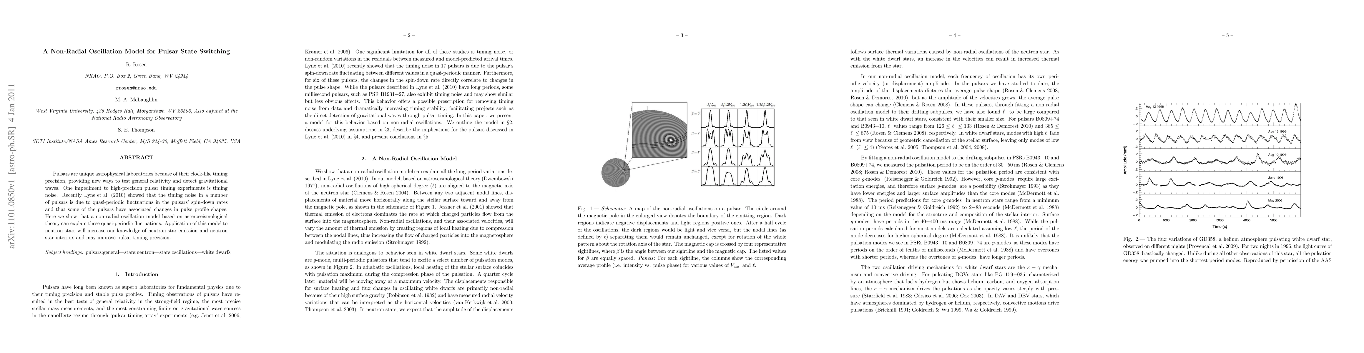 Pulsars are unique astrophysical laboratories because of their clock-like timing precision, providing new ways to test general relativity and detect gravitational waves. One impediment to high-precision pulsar timing experiments is timing noise. Recently Lyne et al. (2010) showed that the timing noise in a number of pulsars is due to quasi-periodic fluctuations in the pulsars' spin-down rates and that some of the pulsars have associated changes in pulse profile shapes. Here we show that a non-radial oscillation model based on asteroseismological theory can explain these quasi-periodic fluctuations. Application of this model to neutron stars will increase our knowledge of neutron star emission and neutron star interiors and may improve pulsar timing precision.