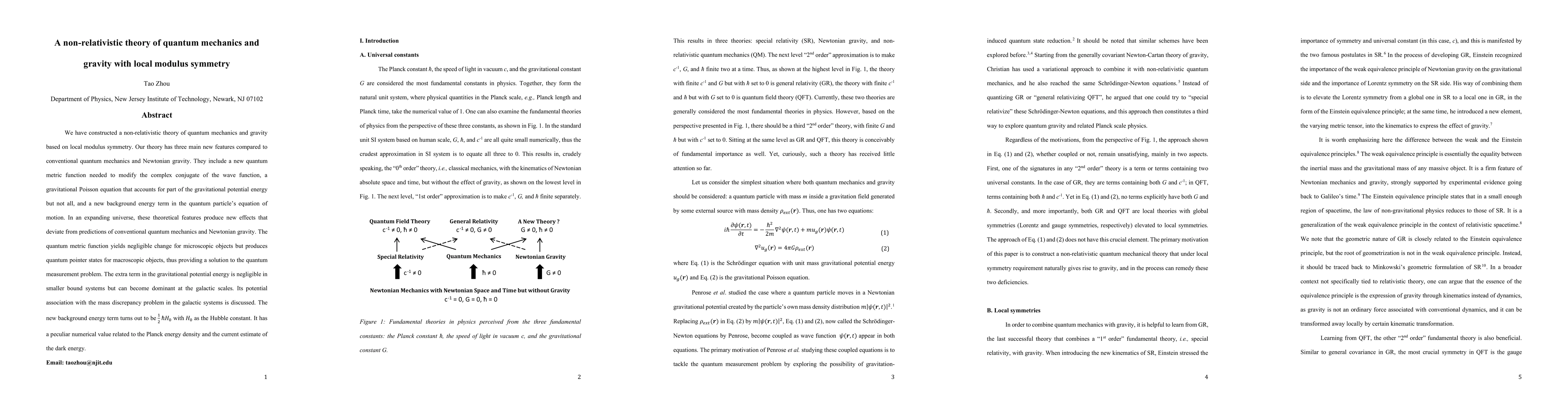 Inspired by the similarities between quantum field theory and general relativity, in that each theory encompasses two universal constants and a local symmetry, we set out to construct a non-relativistic theory of quantum mechanics and gravity based upon two assumptions: quantum system remains invariant to local modulus transformation, and physical laws reduce to those of conventional quantum mechanics in small enough region, i.e. a modified version of the equivalence principle. Imposing local modulus symmetry brings a number of changes, including the replacement of the complex conjugate of the wave function by a new scalar function with the same phase but different modulus, and particle momentum operator built on covariant derivative, with a connection of purely imaginary velocity field that is identified as the gravitational escape velocity. Three quantum metric functions are defined to signify the kinematic change of quantum state brought by gravity. The modified equivalence principle enables us to relate the escape velocity field with the quantum metric functions. Equation of motion and field equation that are covariant to local modulus transformation are constructed. New features in these equations offer potential mechanisms to account for the dark energy, the mass discrepancies in the universe, and the quantum state reduction of macroscopic objects.