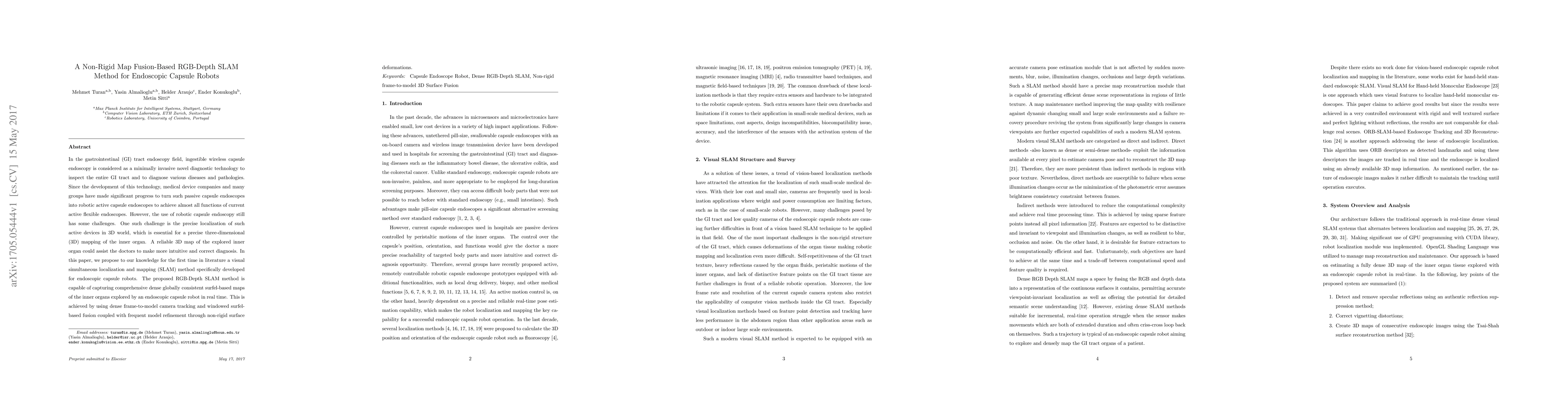 The paper proposes a visual SLAM method for endoscopic capsule robots, utilizing shape-from-shading surface reconstruction and time-windowed surfel-based dense data fusion with frame-to-model tracking and non-rigid deformations.