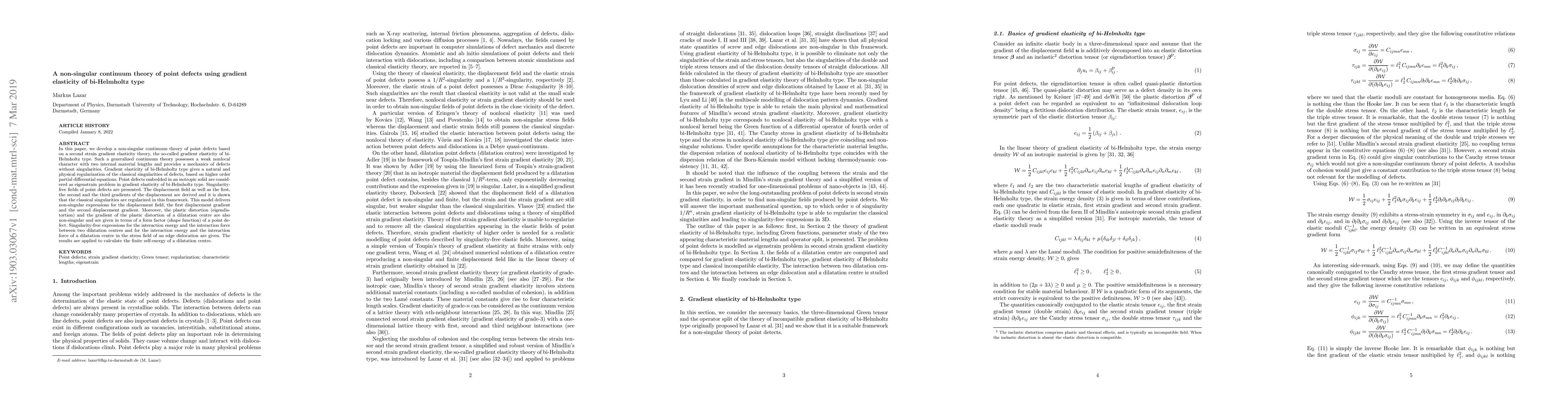 This paper develops a non-singular continuum theory of point defects using gradient elasticity of bi-Helmholtz type, which provides a mechanics of defects without singularities through a weak nonlocal character and two internal material lengths. The model regularizes classical singularities and delivers non-singular expressions for displacement fields and plastic distortions.