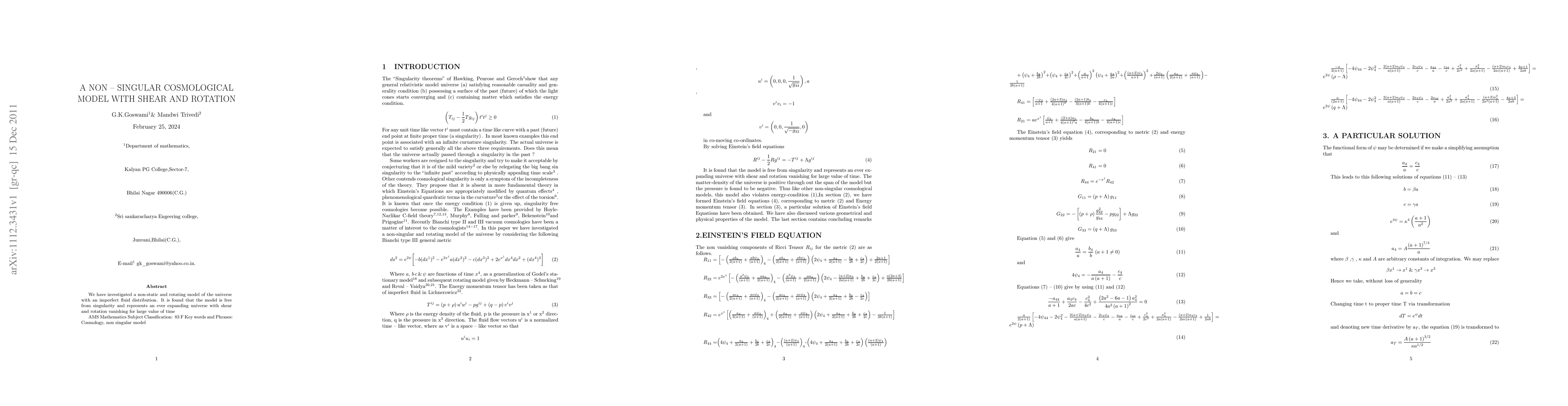We have investigated a non-static and rotating model of the universe with an imperfect fluid distribution. It is found that the model is free from singularity and represents an ever expanding universe with shear and rotation vanishing for large value of time.