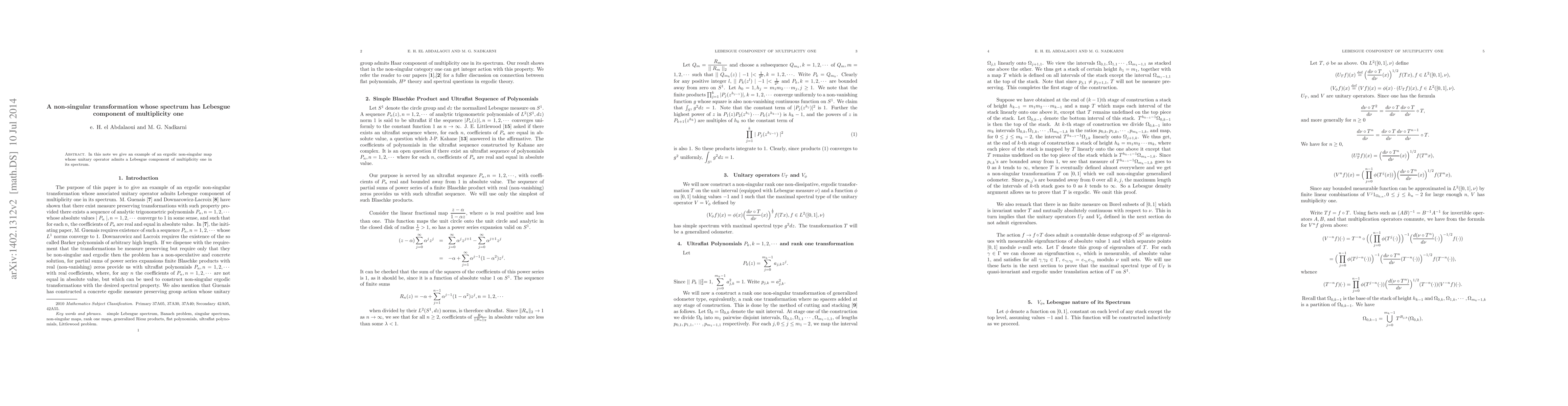 This research paper introduces an ergodic non-singular map whose unitary operator has a Lebesgue component of multiplicity one in its spectrum, providing a rare example of such a phenomenon.