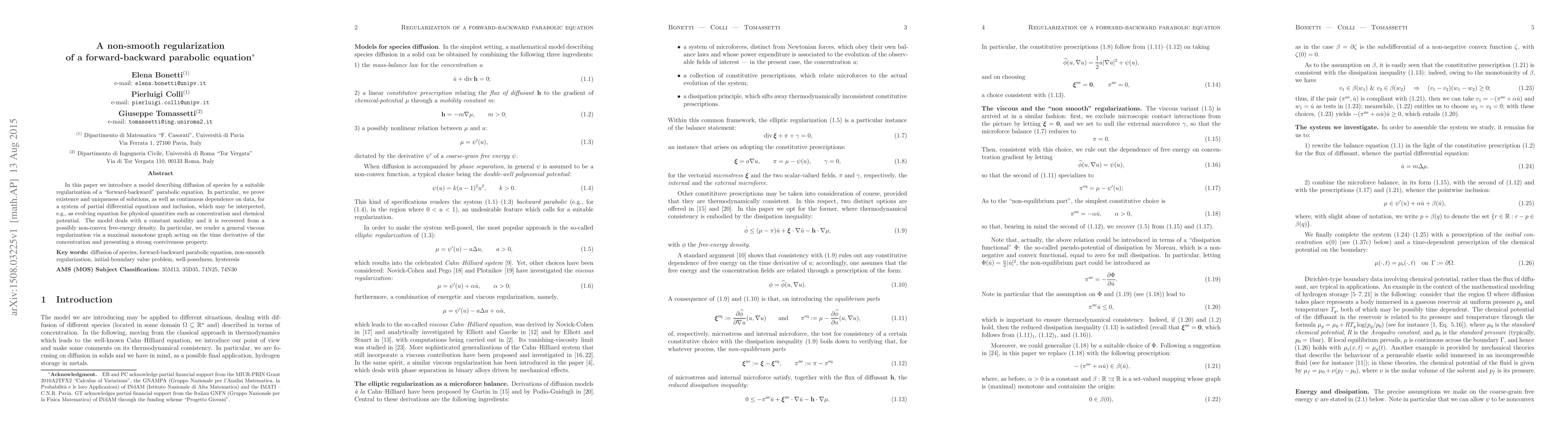 This paper introduces a model for diffusion of species with a non-smooth regularization of a forward-backward parabolic equation, proving existence and uniqueness of solutions.