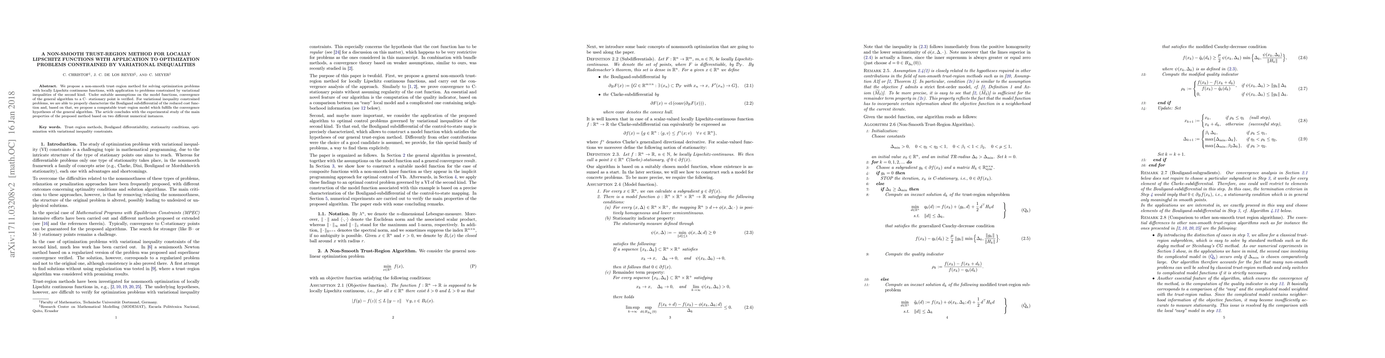 This paper proposes a nonsmooth trust-region method for solving optimization problems with locally Lipschitz continuous functions, particularly for those constrained by variational inequalities. The method is shown to converge to a C-stationary point under suitable assumptions, and it includes a computable trust-region model for variational inequality problems. Experimental results demonstrate the method's effectiveness.